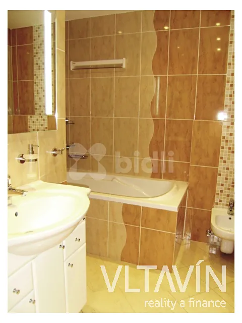Kuchyň je kompletně vybavena včetně myčky, el. sporáku a lednice s mrazákem. Koupelna je s vanou a pračkou, WC je samostatné. Součástí bytu je také velká šatna (9m2) s vestavěnými skříněmi. Podlahy jsou dřevěné a dlažba. K bytu také náleží zasklená lodžie a sklep. Pro pohodlí nájemníků je v bytě také klimatizace.