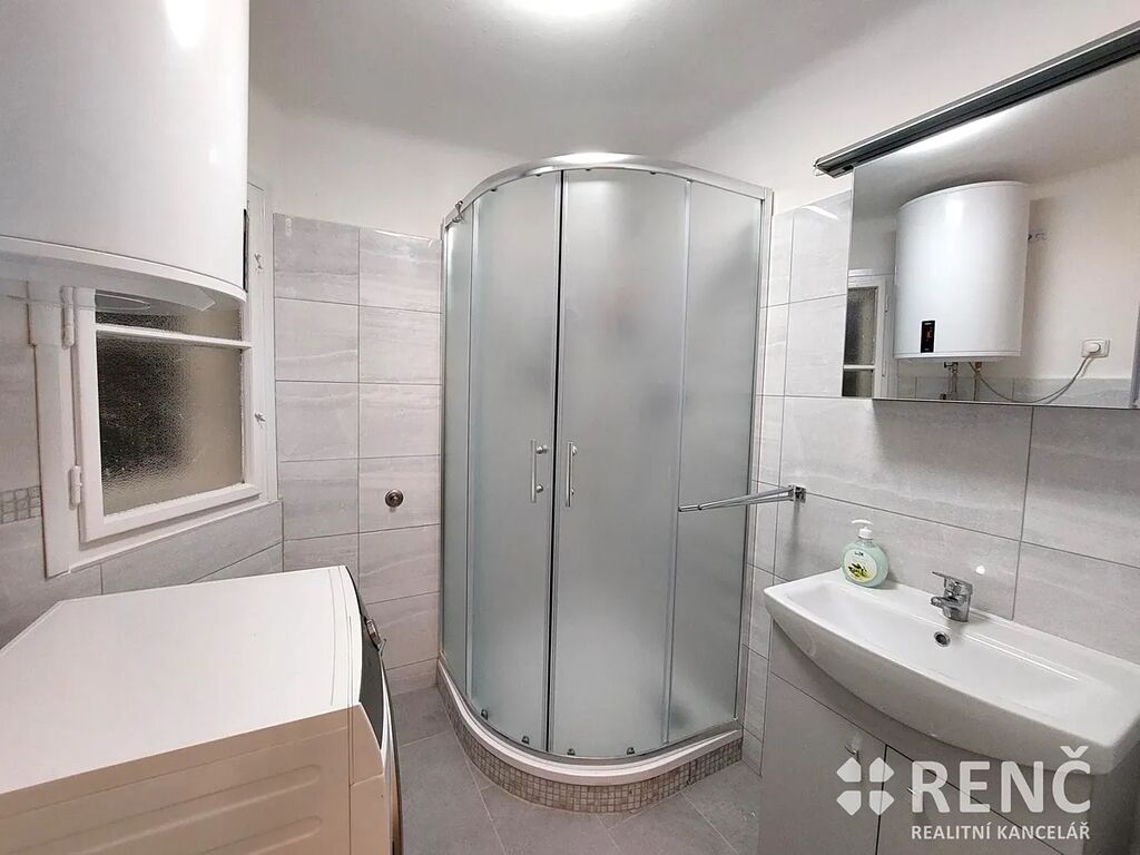 Koupelna je společná s WC, je vybavena umyvadlem, sprchovým koutem, koupelnovým nábytkem (skříňka pod umyvadlem, zrcadlová skříňka) a pračkou. Je zde umístěn bojler na ohřev vody.