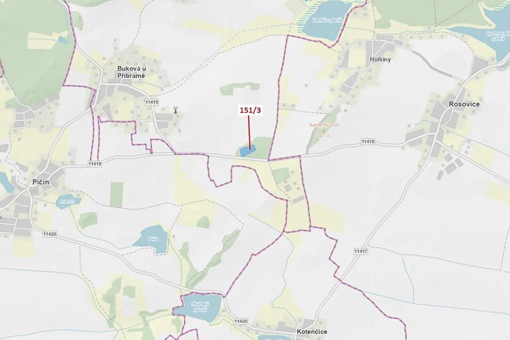 Lesní pozemek o výměře 9 307 m2, parcelní číslo 151/3, podíl 1/1, katastrální území Buková u Příbramě, obec Buková u Příbramě, obec s rozšířenou působností Příbram, okres Příbram, Středočeský kraj. Po těžbě.