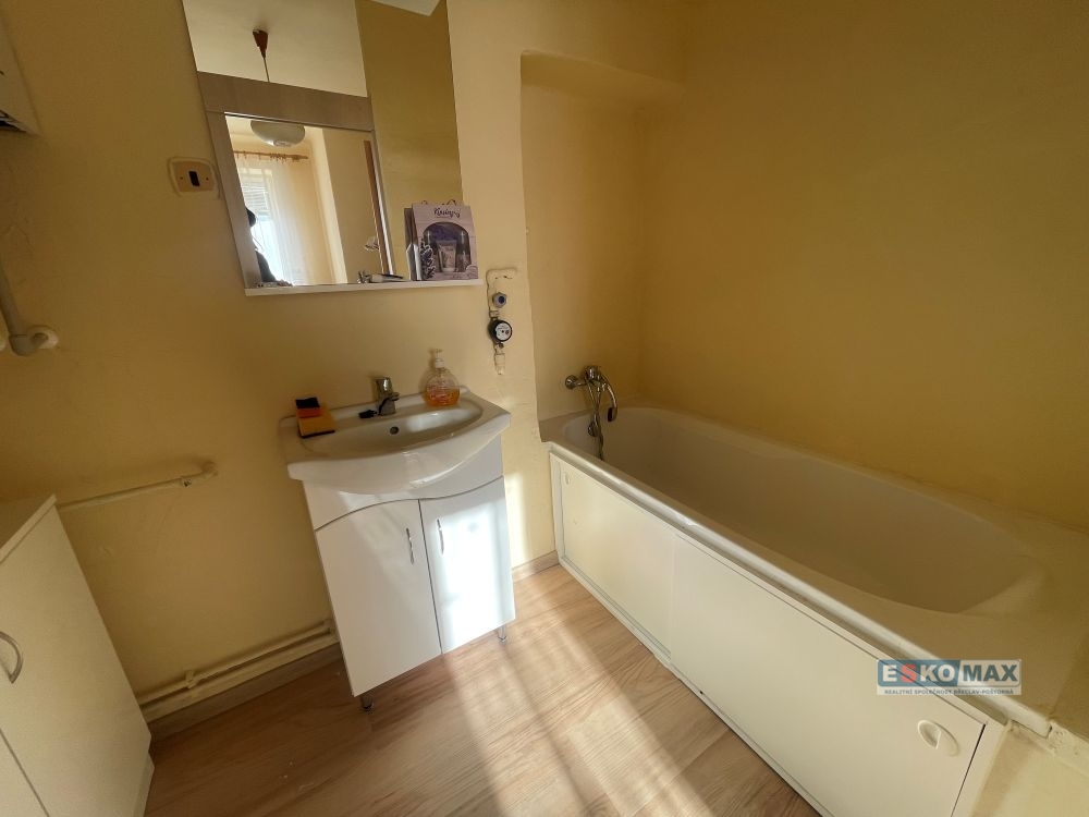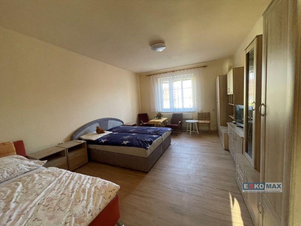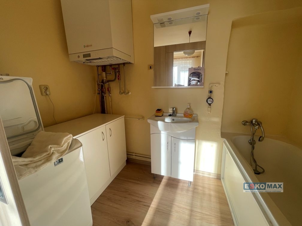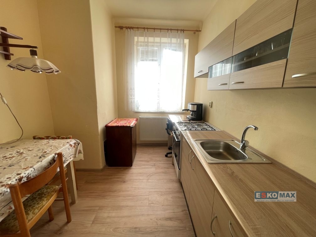 Dispozice – kuchyně, pokoj, chodba, šatna, koupelna, samostatné WC s oknem, balkon. Příslušenstvím bytu je sklep. Byt je po rekonstrukci, pronajímá se včetně zařízení, které je na fotkách (nová vestavěná skříň na chodbě, pračka, postele, obývací stěna, televize a pod.). Za domem je společný dvorek, který lze také využívat. Bytový dům je po částečné revitalizaci – vnější omítky, rozvody IS ve stoupačkách, vchodové dveře. Ideální bydlení pro 1 – 2 osoby bez zvířat. Nájemné je celkem 15.000,-Kč/měsíc včetně zálohy na energie ve výši cca 3.000,-Kč/měsíc. Vytápění je plynovým kotlem v koupelně.
