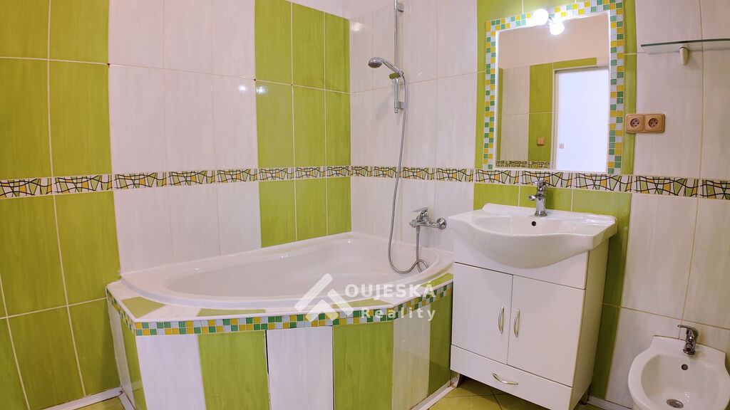 Byt o velikosti 103 m² se nachází v 1. patře cihlového domu. Nabízí pohodlný obývací pokoj s kuchyňským koutem a jídelnou, prostorné ložnice, podkrovní pokoj, koupelnu s vanou a samostatné WC.