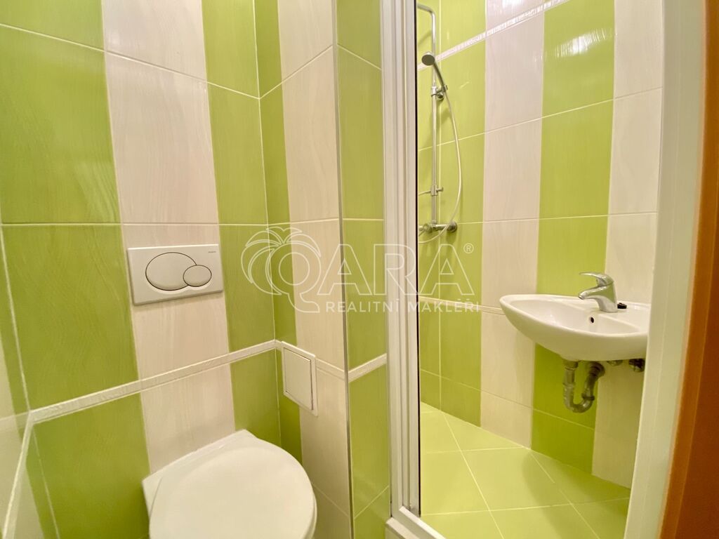 Koupelna spojená s WC je menší a disponuje sprchovým koutem a malým umyvadlem.