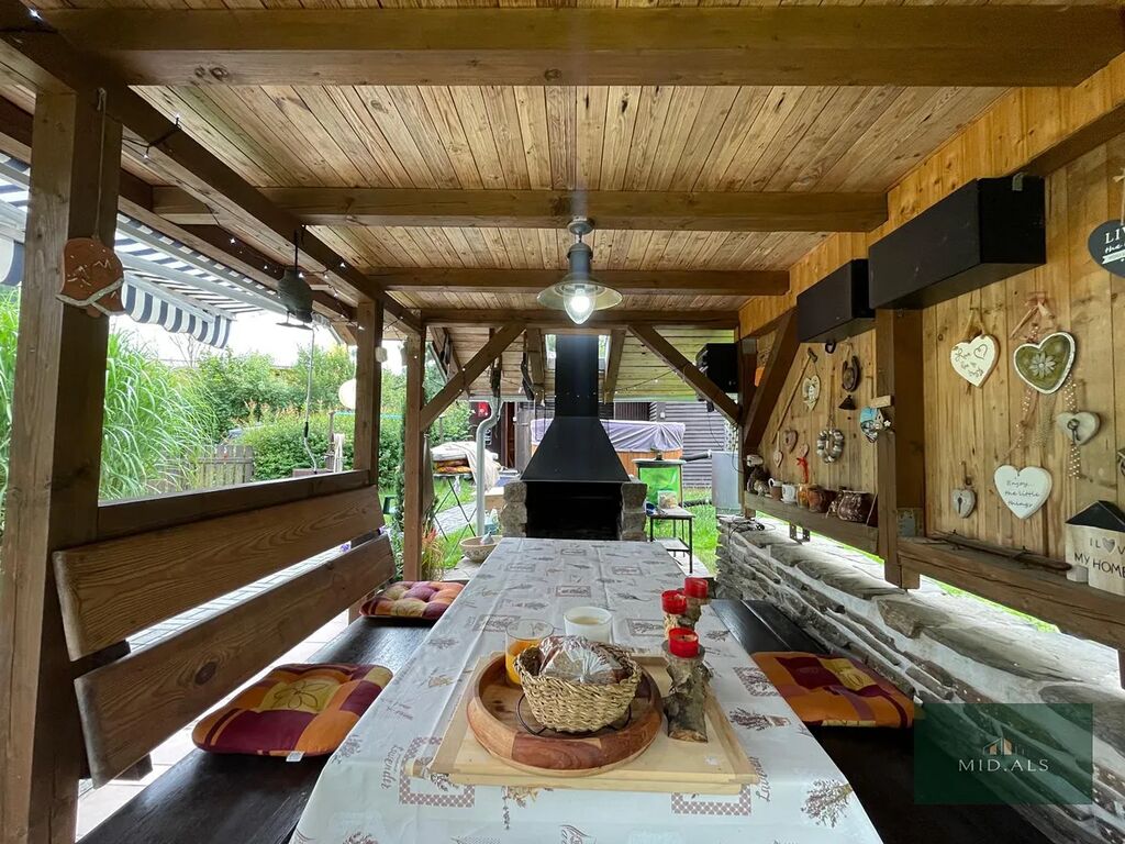 Na zahradě najdeme stylové zastřešené venkovní sezení s krbem, menší půda nad sezením může být využita jako alternativní možnost přespání, či jen jako úložný prostor.