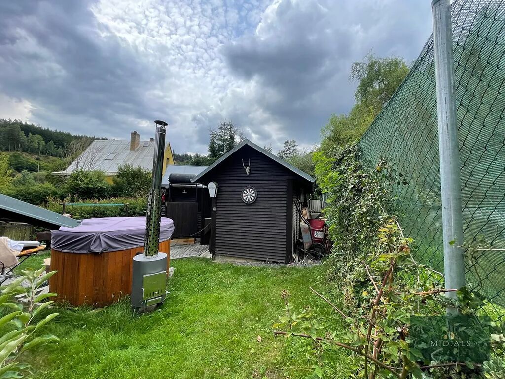 Dále koupací sud, který se dá využít jak ke zchlazení, tak i k ohřátí těla. Dřevěná dílna s veškerým náčiním pro kutily, a vedle samostatná infra sauna pro dvě osoby. Před saunou je instalována venkovní sprcha. O kousek dále je ohniště, okrasné stromy zajišťující soukromí, a stále je zde prostor i na bezvadný bazén, vířivku, nebo cokoli dalšího.