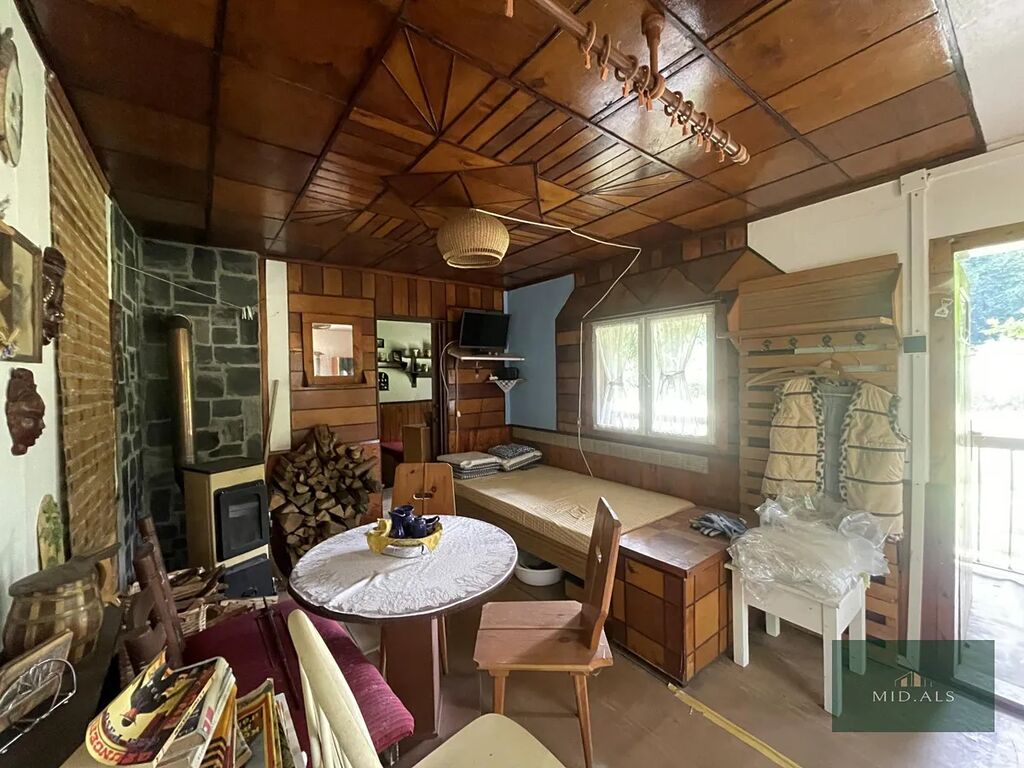 Chata je dřevěná na betonové podezdívce, podsklepená, s teráskou k posezení.