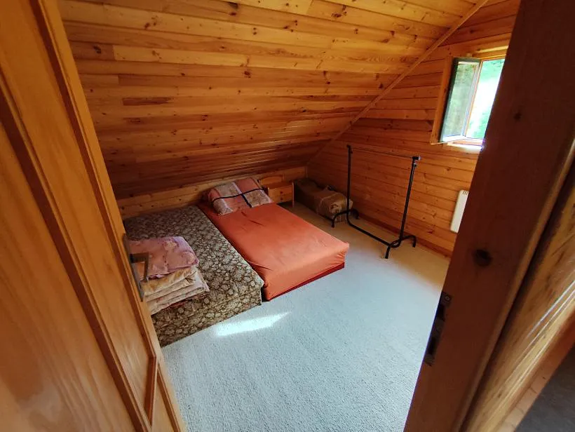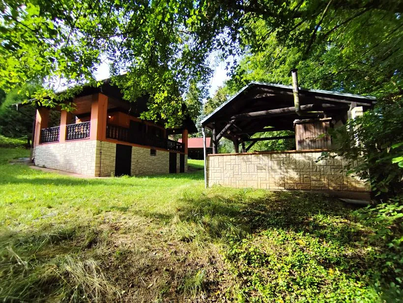 Cihlová stavba původně ze sedmdesátých let byla v posledním desetiletí komplexně přestavěna, rozšířena byla dispozice podlaží na 57 m2. V suterénu najdeme koupelnu s WC, dílnu a sklad nářadí, ze zvýšeného přízemí vstoupíme bočním schodištěm do haly s kuchyňským koutem a schodištěm do podkroví se čtyřmi ložnicemi. Interiéry jsou kompletně provedeny ve dřevu - palubkové obložení, podlahy, stropy, schodiště, kuchyňská linka. Dřevěnou konstrukci má terasa s výhledem k řece Berounce. Chata je zateplena, nová fasáda a střecha z bonského šindele. Zavedena el, voda vlastní vrt s pitnou vodou, žumpa, vytápění krbová kamna a v podkroví v každé ložnici přímotopem. Pod chatou směrem k řece stojí krytá pergola s posezením, krbem a udírnou, ke hranici pozemku je umístěno kryté parkovací stání.