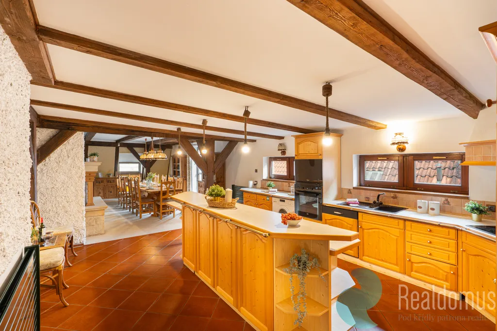 Společenská část bytu se rozprostírá v nižším patře a zaujme svou velkorysostí, atmosférou i promyšleným dispozičním řešením. Dominantou prostoru je prostorný obývací pokoj s krbem, který tvoří přirozené centrum domova a místo pro setkávání i odpočinek. Na obývací část plynule navazuje jídelna s dostatkem prostoru pro rodinná i přátelská setkání a moderní kuchyň vybavená vestavěnými spotřebiči, kvalitní pracovní plochou a velkorysým úložným prostorem. Celý interiér působí útulně a harmonicky, s důrazem na kvalitní materiály a detailní zpracování.