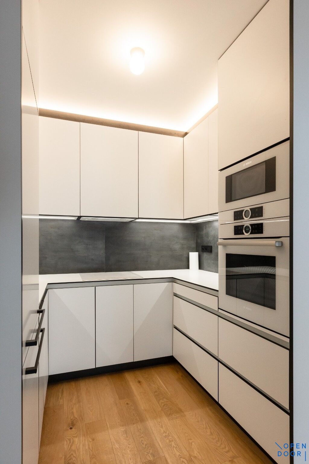Velice vzdušný a světlý byt se nachází v 1. patře domu a je vybavený ve vysokém standardu. Ve spodním patře bytu je situovaný prostorný obývací pokoj s kuchyňským koutem. Ten je zařízený nadstandardní kuchyňskou linkou vybavenou veškerými spotřebiči  - indukční varná deska, vestavná trouba a mikrovlnná trouba, myčka a lednička s mrazákem. Samotný obývací pokoj působí i díky zachovanému trámoví velice útulně, přičemž okna jsou směřována do tichého vnitrobloku.