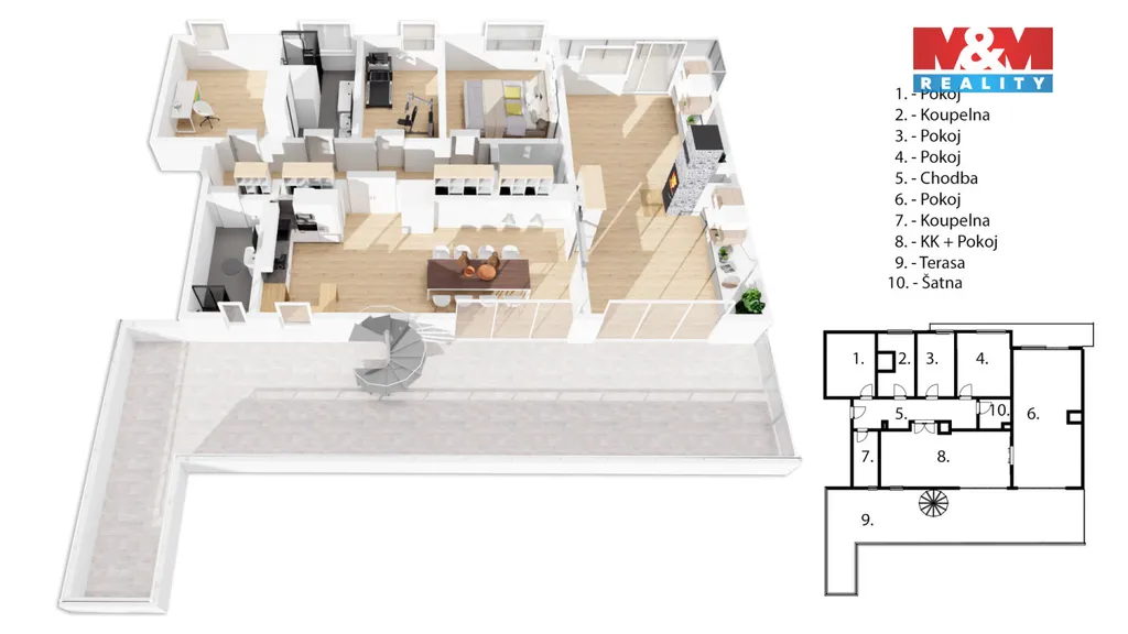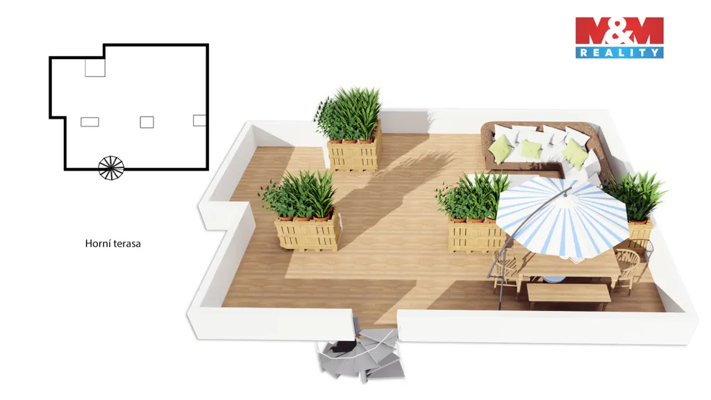 V prestižní lokalitě v samém srdci Prahy nabízíme unikátní byt o dispozici 5+kk o podlahové ploše 175,8 m² se dvěma slunnými terasami v 6. NP 63,9 m² a v 7. NP 132,1 m² s dechberoucím výhledem na Prahu, severní balkón 8 m² a navíc prostorný sklep o velikosti 13,2 m². Interiér nabízí prostornou vstupní chodbu s vestavěnými skříněmi a samostatnou šatnou, tři ložnice, dvě koupelny s kamennou podlahou s podlahovým vytápěním, značkovým sociálním zařízením Villeroy&Boch s hudebním systémem. Dominantou bytu je velkorysý obývací pokoj se zvýšeným stropem, krovy a krbem, prostorná jídelní místnost, kuchyňský kout s podlahovým vytápěním, s vestavěnými spotřebiči luxusní zn. SMEG, americkou chladničkou a vinotékou. Dalšími nadstandardními prvky jsou dubové odhlučněné podlahy, knihovna s LED osvětlením, klimatizace Toshiba v každém pokoji, odhlučněné stěny. Možné přikoupit garážové stání + 1mil. Kč. Byt nabízí naprosté soukromí, špičkový komfort a výjimečný výhled na celou Prahu.