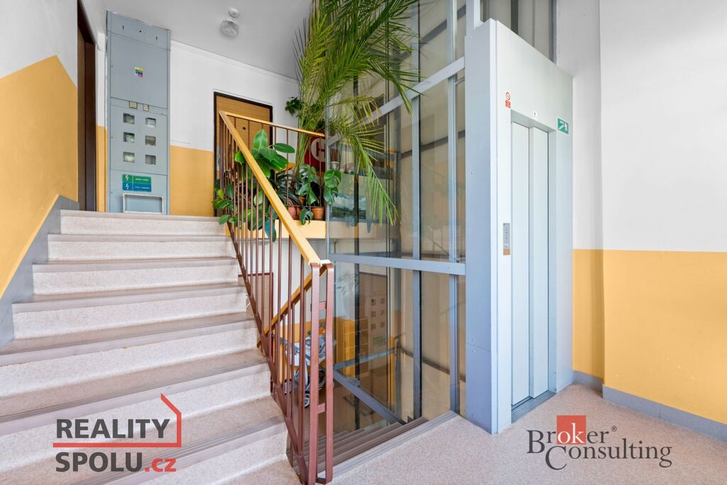 V domě je moderní výtah, dům je zateplen, má plastová okna a od letoška nové vchodové dvěře.