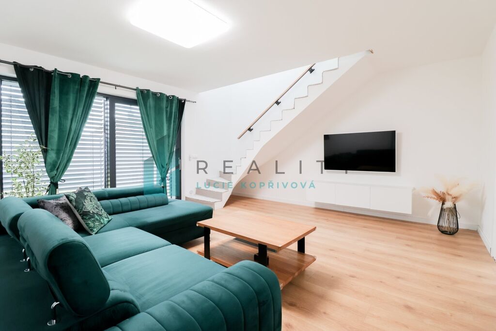 Dominantou domu je prostorný a slunný obývací pokoj, který propojuje interiér s patrem elegantní točité schodiště. Na obývací pokoj navazuje kuchyně s jídelním koutem, která je od obývací části jemně oddělena, aby zůstalo zachováno jak propojení, tak i potřebné soukromí. Kuchyňská linka byla vyrobena na míru v nadčasovém stylu a je doplněna o praktickou spíž.