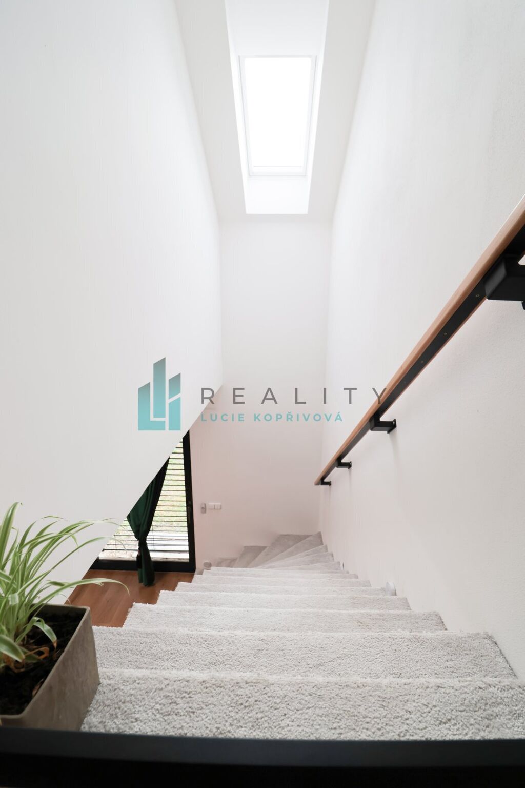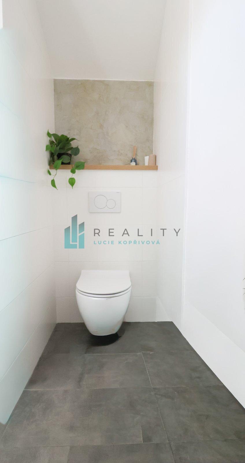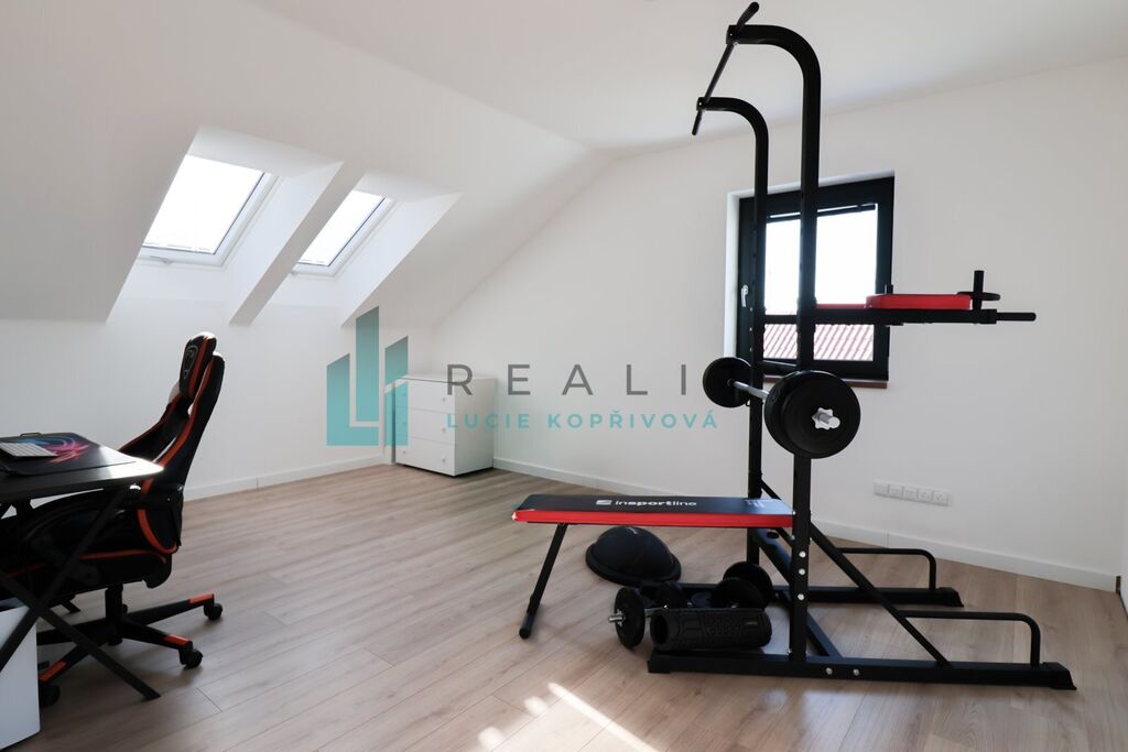 Dále pak dům nabízí prostory pracovny, ložnici a dva dětské pokoje, kdy z jednoho je nyní prostorná šatna, dvě koupelny jedna s vanou a druhou se sprchovým koutem a dvě toalety, každá v jednom patře, terasu, technickou místnost a garáž.