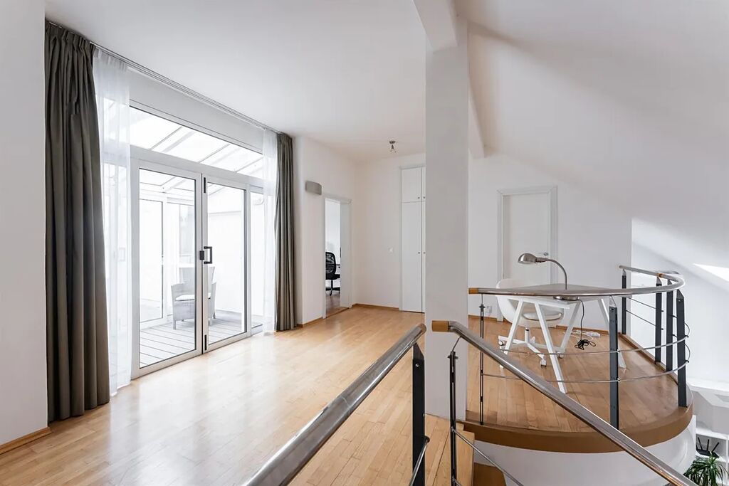 Luxusní prostorný mezonet s terasou a zimní zahradou, 5+kk (4 ložnice, 3 koupelny) o celkové rozloze 248 m2 je situovaný v 6. a 7. patře rezidenčního domu s výtahem. Byt nabízí obývací pokoj s plně vybavenou kuchyní (sporák/trouba, lednice, myčka) oddělenou skleněnou příčkou, 4 ložnice situované do klidné zóny vnitrobloku, 3 koupelny (sprcha, vana, bidet), 2x šatnu, komoru a prádelnu. Byt je vybaven nábytkem. Terasa a zimní zahrada jsou situované na jižní stranu. Nádherný výhled na Hradčany. SAT, telefonní linka a internet.