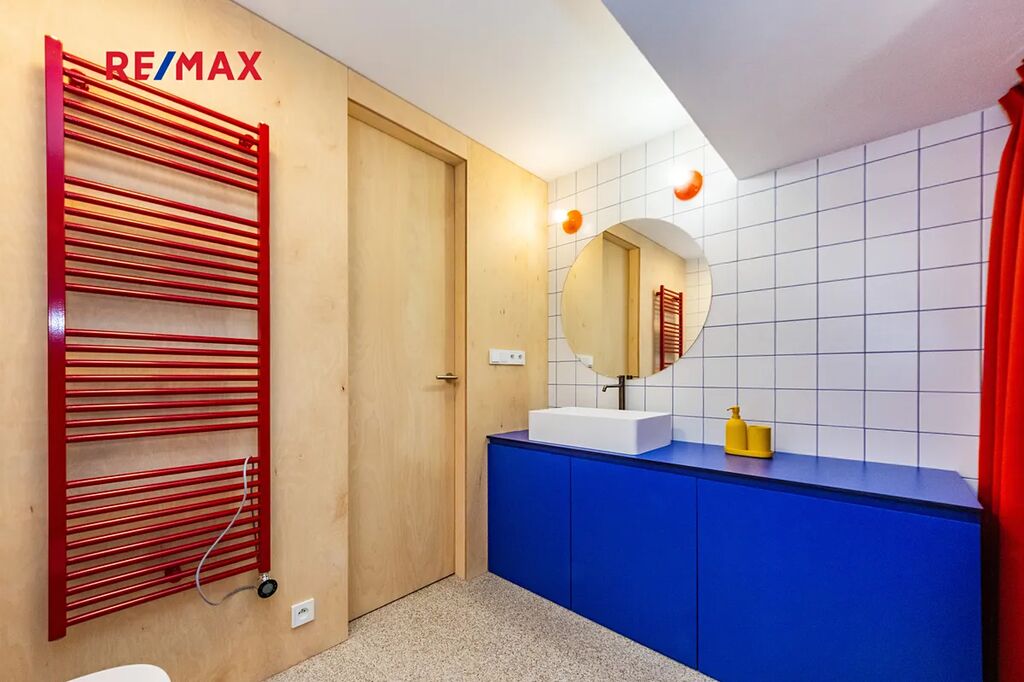 V bytě se dále nachází prostorná koupelna se sprchovým koutem, toaletou a prostorem pro pračku. Veškerý nábytek a vybavení bylo vyrobeno na míru, s důrazem na praktičnost a kvalitní zpracování.