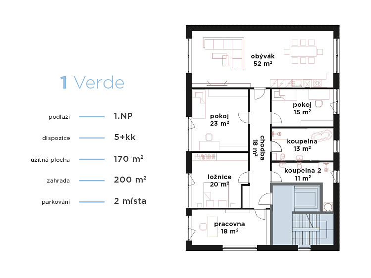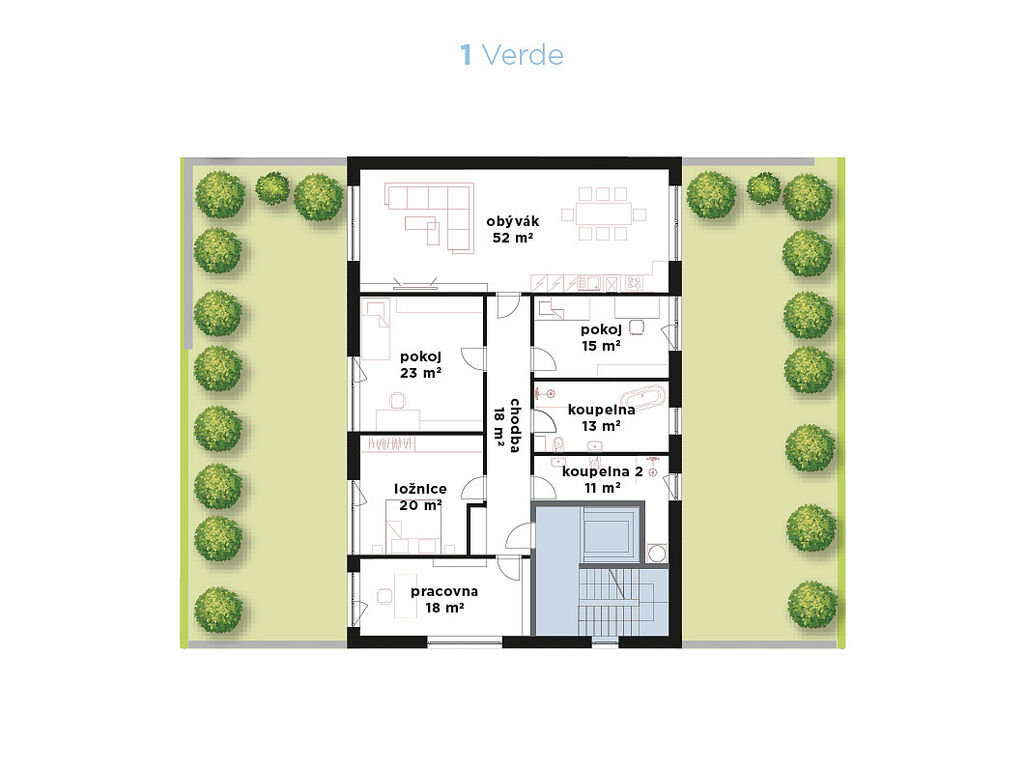 Ve 2. NP je k dispozici byt 5+kk Verde, který disponuje prostorným obývacím pokojem s kuchyňským koutem, výstupem na terasy a následně na zahrady ze dvou stran bytu, master ložnicí, dvěma pokoji, pracovnou, koupelnou s vanou, sprchovým koutem, toaletou, druhou koupelnou se sprchovým koutem, toaletou, technickým prostorem, vstupní chodbou a zahradou 210 m².