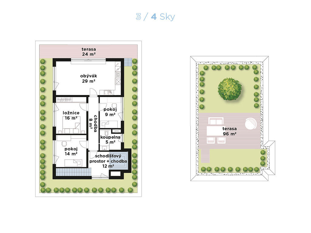 • 3 byty 5+kk užitná plocha každého bytu je172 m², byty mají zahrady v celkové ploše 740 m²
