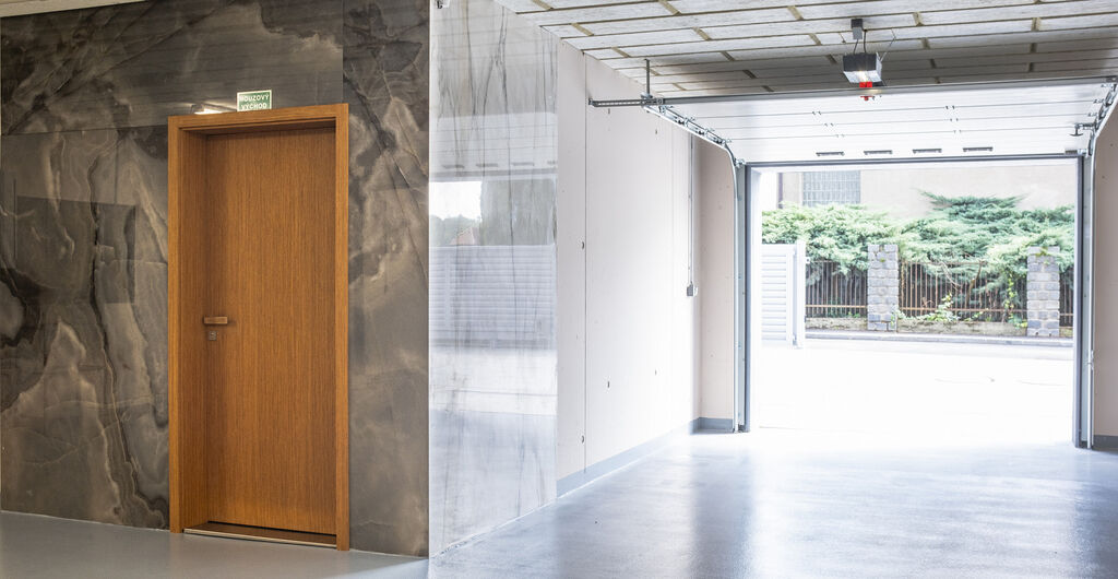 V 1.NP jsou umístěna garážová stání pro 5 aut, sklepy a před domem jsou 4 parkovací místa na pozemku.