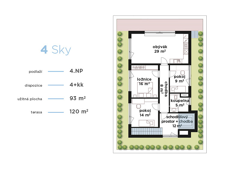 • 1 byt 4+kk 93 m² v 5.NP (s možností vybudování další terasy 110 m²)