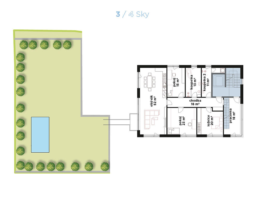 Ve 4. a 5. NP je k dispozici byt Sky, který disponuje dvěma obývacími pokoji s kuchyněmi, třemi ložnicemi, dvěma pokoji, dvěma pracovnami, třemi koupelnami, koupelnou s vanou, sprchovým koutem, toaletou, druhou koupelnou se sprchovým koutem, toaletou, v 5.NP je také koupelna, technickým prostorem a vstupní chodbou. Dále je k dispozici zahrada 310 m² s bazénem a zastřešením. Každý byt lze využít samostatně, obývací pokoje mají kuchyně v každém bytě. Na střeše lze vybudovat terasu o rozloze 110 m²