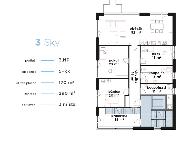 Ve 3. NP je k dispozici bytová jednotka 5+kk Vista, která disponuje prostorným obývacím pokojem s kuchyňským koutem, výstupem na terasu a následně na zahradu, master ložnicí, dvěma pokoji, pracovnou, koupelnou s vanou, sprchovým koutem, toaletou, druhou koupelnou se sprchovým koutem, toaletou, technickým prostorem, vstupní chodbou a zahradou 220 m².