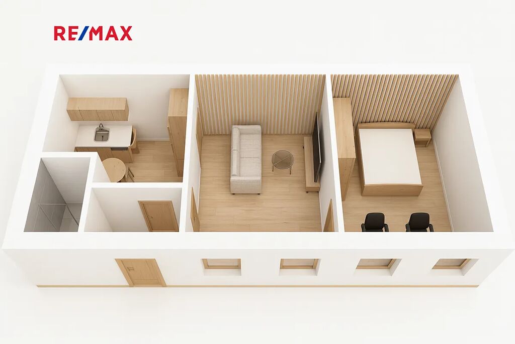 Současná dispozice nabízí vstupní předsíň, prostorný obývací pokoj oddělený částečnou příčkou od ložnice, samostatnou kuchyni se spotřebiči a koupelnu se sprchovým koutem a WC.