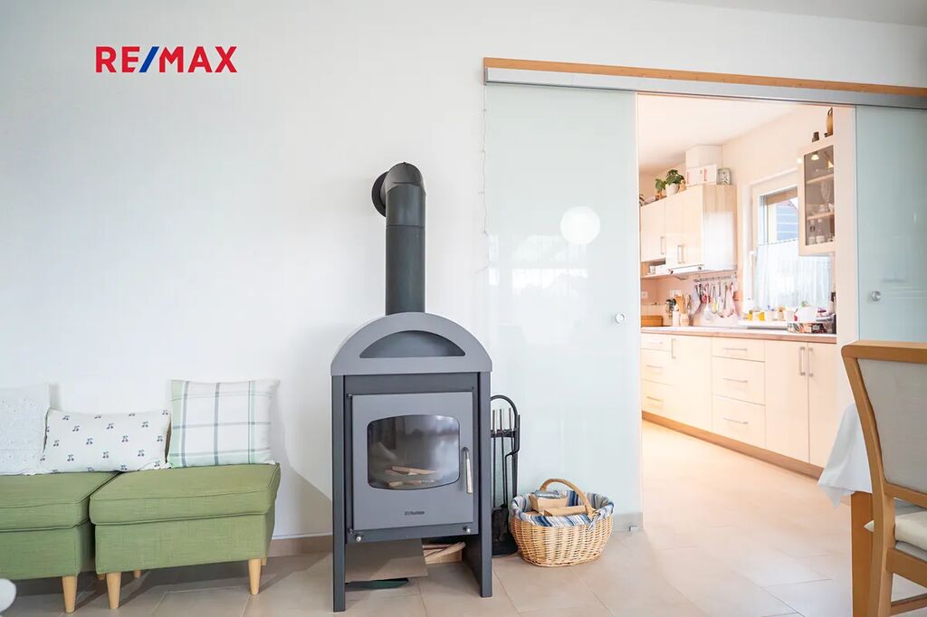 Vytápění je zajištěno podlahovým topením v kombinaci s krbovými kamny na dřevo, které vytvářejí příjemnou atmosféru domova a přispívají k nízkým provozním nákladům. O ohřev teplé vody se stará elektrický bojler o objemu 120 litrů. Samozřejmostí je klimatizace, energeticky úsporné řešení domu, plastová okna s trojskly a napojení na kanalizaci.