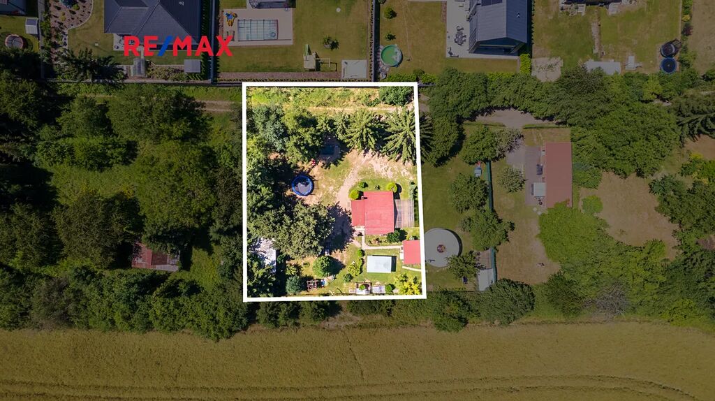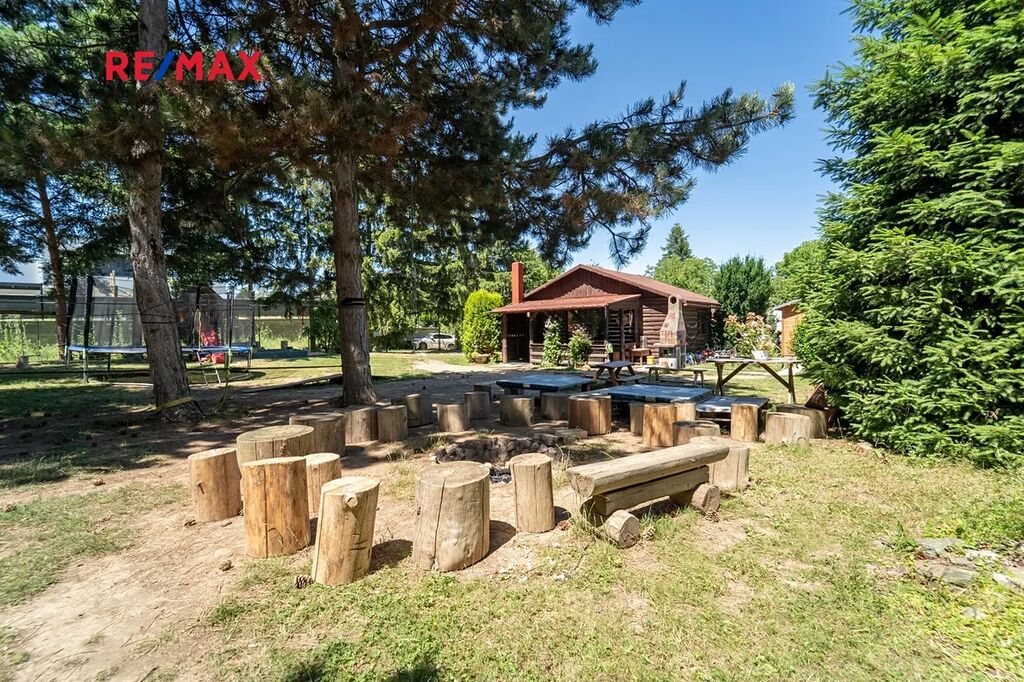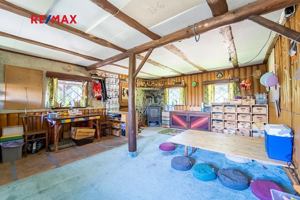 Na pozemku se nachází dřevěný srub s pergolou, kůlna s přístěnkem na dřevo, venkovní sprcha, vrtaná studna o hloubce 40 m s pumpou. Příjemné klima zajišťují vzrostlé stromy. Na pozemku se nacházela lesní školka - zařízení herními prvky bude po dohodě ponecháno nebo odstraněno. K pozemku náleží sloupek připojení EE ve vzdálenosti asi 110 m, nyní je přivedena elektřina ze sousedního severního pozemku s podružným měřením .