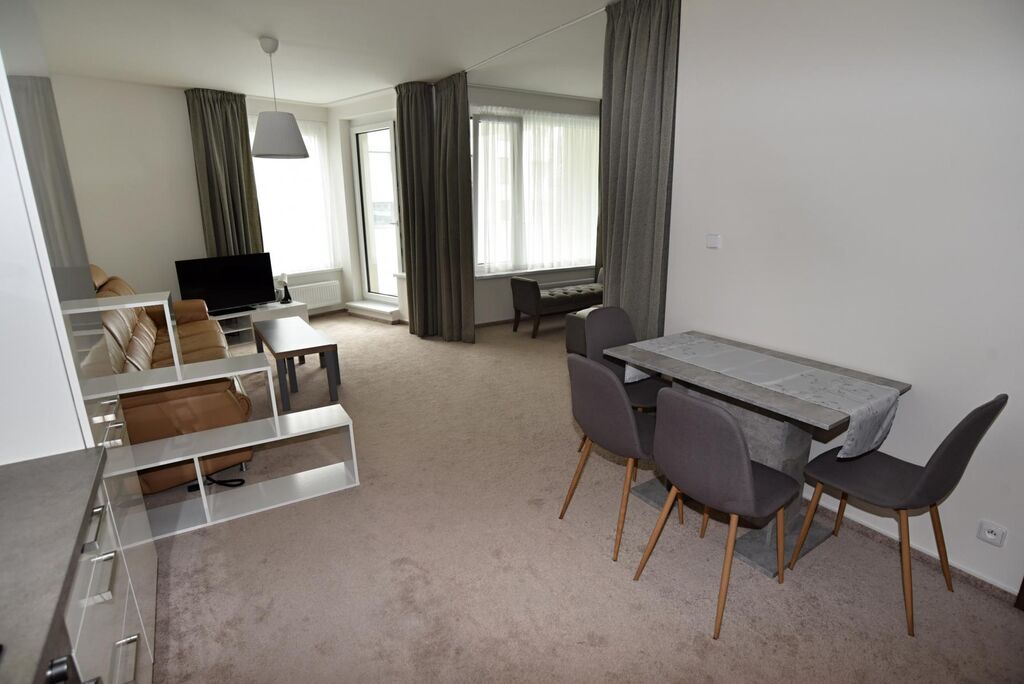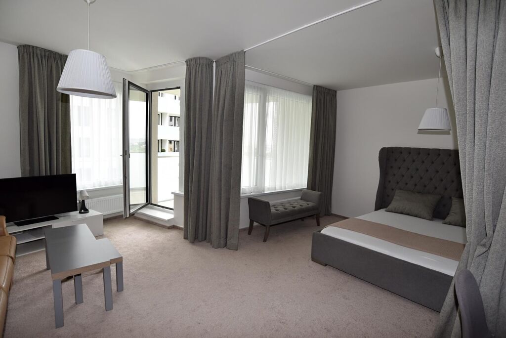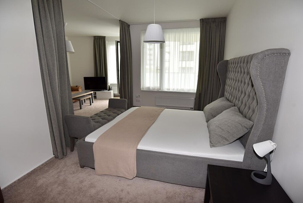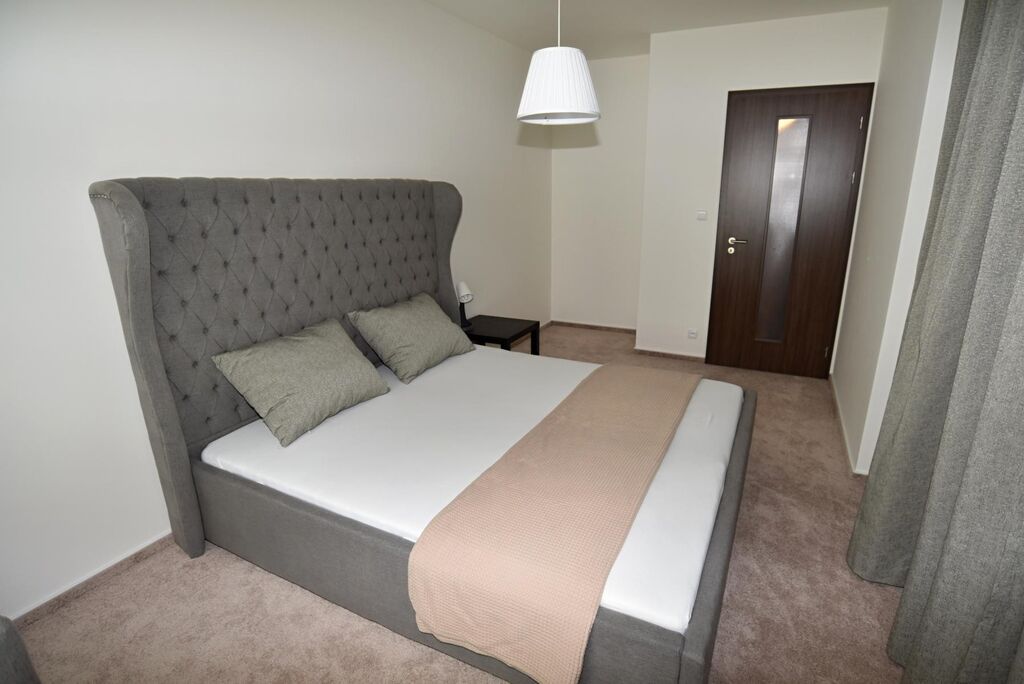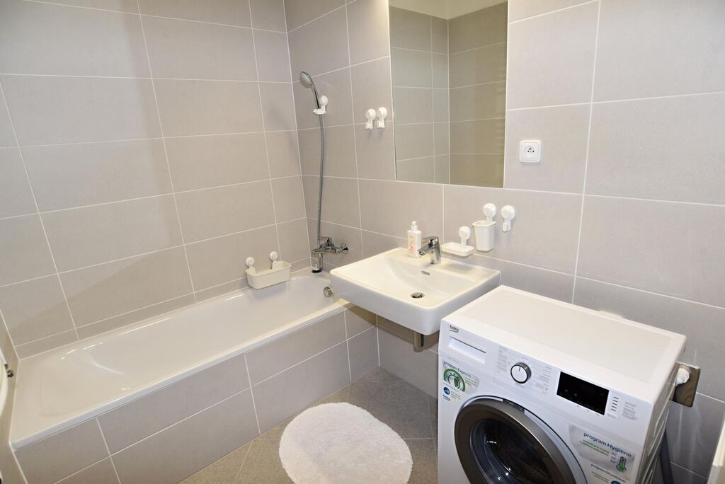 Velkou výhodou je samostatná šatna, která poskytuje dostatek úložných prostor, a moderní koupelna s vanou a pračkou. Interiér je laděn do moderního a nadčasového stylu, který podtrhují kvalitní materiály, koberce na podlahách a promyšlené designové detaily, díky nimž působí byt mimořádně útulně a harmonicky.