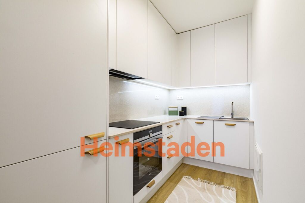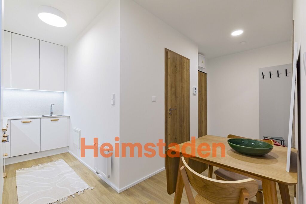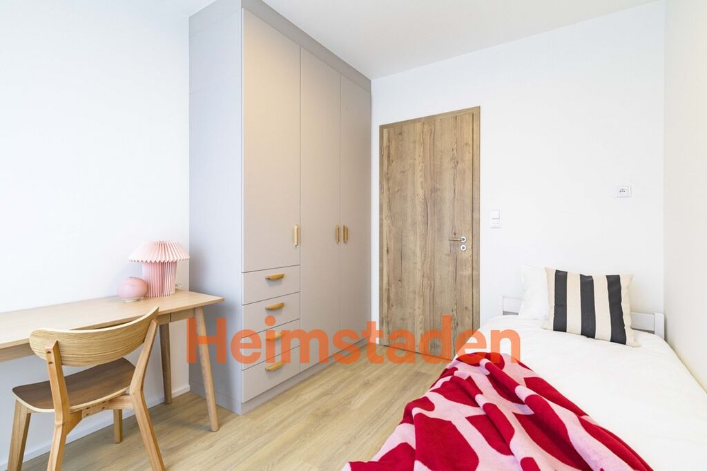 Byt se nachází v moderním rezidenčním domě s výtahy a zahrnuje kompletně vybavenou kuchyň s vestavěnými spotřebiči, jako jsou myčka, indukční varná deska, trouba, lednice a mrazák. Kuchyň plynule navazuje na jídelní část, která vytváří příjemné místo pro každodenní setkávání. Oba pokoje jsou zařízeny nábytkem na míru – postelí, pracovním stolem, šatní skříní a dalším vybavením potřebným k okamžitému nastěhování. Samozřejmostí je moderní koupelna s WC a pračkou. O dokonalý komfort se starají i venkovní rolety, které zajišťují soukromí a příjemné klima v bytě po celý rok.