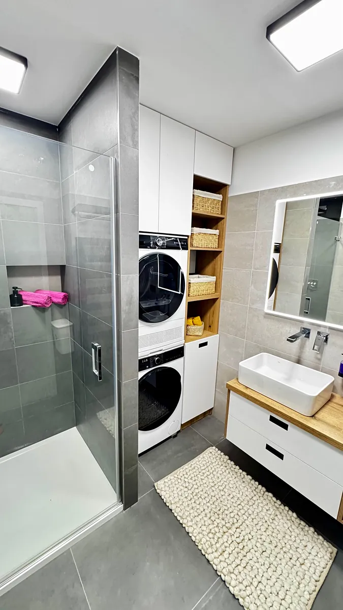V předsíni je vestavěná skříň a předsíňová stěna. V koupelně je vestavěná stěna s pračkou, sušičkou a úložným prostorem.