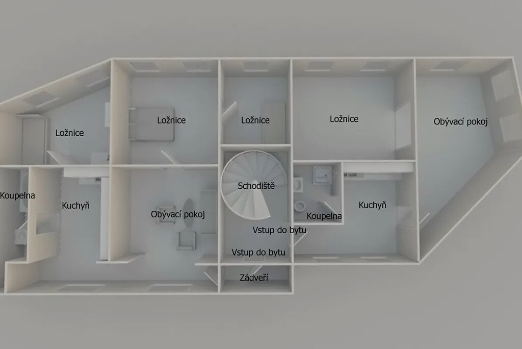 Byty jsou v patře (o dispozicích 4+1 a 2+1) dohromady o podlahové ploše 170 m². S možností okamžitého pronájmu nebo vlastního bydlení. Každý byt má samostatný vstup, vlastní zdroj vytápění a dostatek přirozeného světla. Nad byty je prostorná půda pro vybudování obytného podkroví.