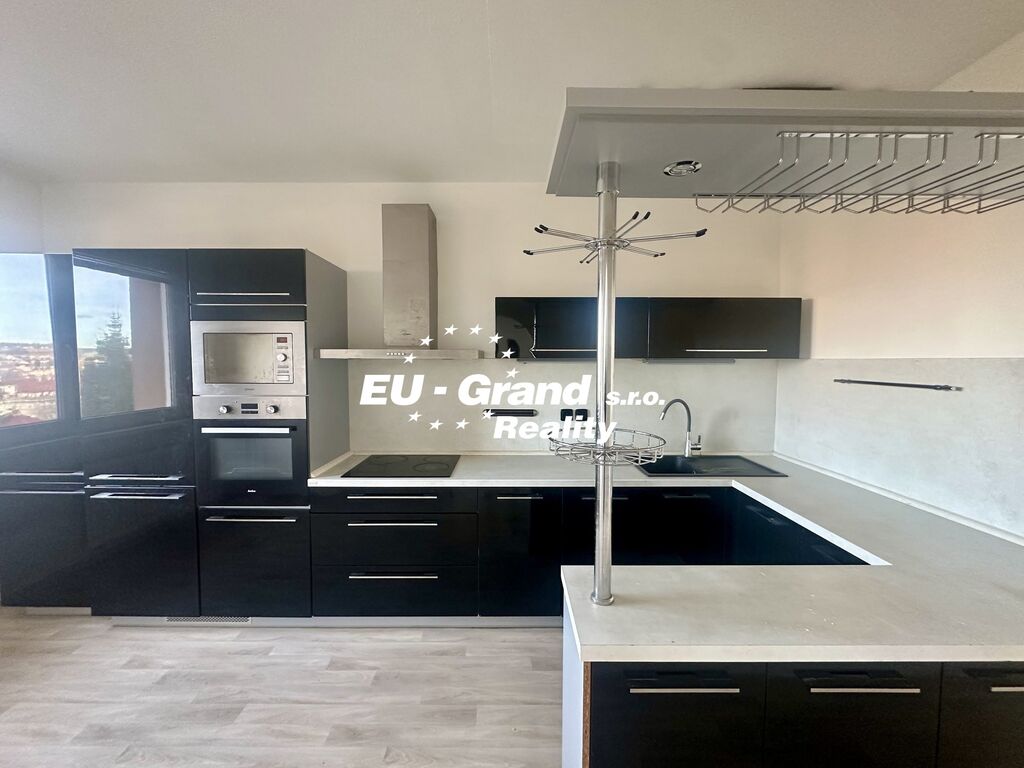 Dominantou bytu je moderní, krásná a prostorná kuchyň v elegantním černo-bílém provedení. Je vybavena vestavnými spotřebiči (trouba, mikrovlnná trouba, varná deska, digestoř), velkorysou pracovní plochou a dostatkem úložného prostoru. Stylový barový pult opticky odděluje kuchyň od obytné části a zároveň poskytuje příjemné místo pro stolování nebo posezení.