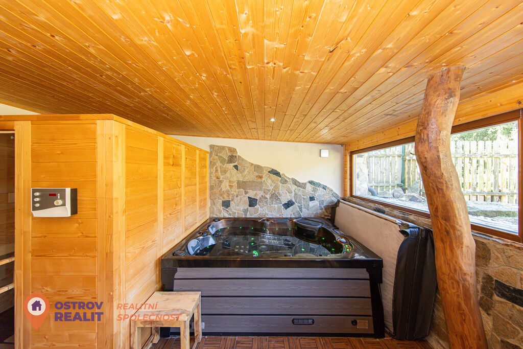 Nově vybudovaná wellness zóna (finská sauna, vířivka, sprcha, odpočívárna, vstup do zahrady, ochlazovací sud)