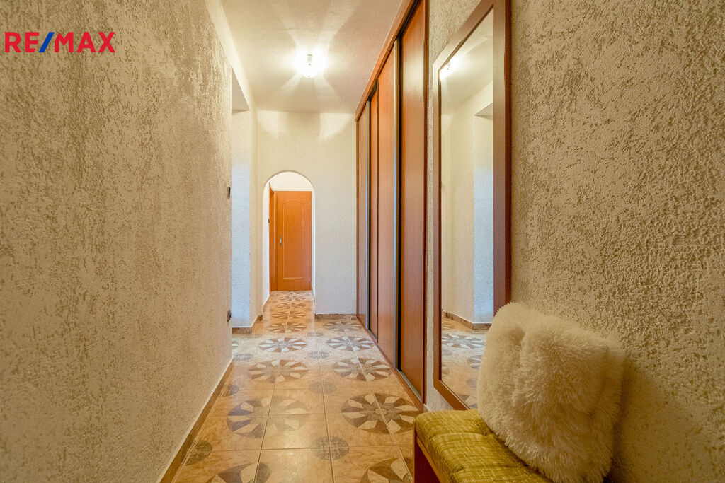 Na chodbě je umístěna zakázkově dělaná vestavěná skříň, která nabízí velkorysý úložný prostor. Součástí vybavení bytu je také plně zařízená kuchyňská linka, včetně lednice, trouby, mikrovlnné trouby. Prodáváno s kompletním na zakázku vyrobeným nábytkem, který je na fotografiích.