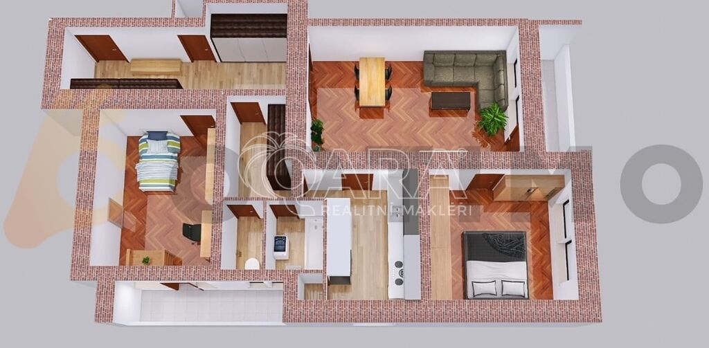 Byt má prakticky řešenou dispozici. Vstupní chodba je vybavena vestavěnými skříněmi a navazuje na samostatnou ložnici s postelí, úložným prostorem a přímým vstupem na první balkon. Další průchozí chodba nabízí opět vestavěné skříně a úložné prostory. Koupelna je vybavena vanou a pračkou, toaleta je oddělená. Samostatná kuchyň disponuje veškerými spotřebič a také samostatnou komorou. Na kuchyň navazuje prostorný obývací pokoj se vstupem na druhý balkon a přístupem do další samostatné ložnice, která je rovněž zařízena postelí a vestavěnými skříněmi. V předsíni je navíc další komora, která poskytuje dostatek úložného prostoru.