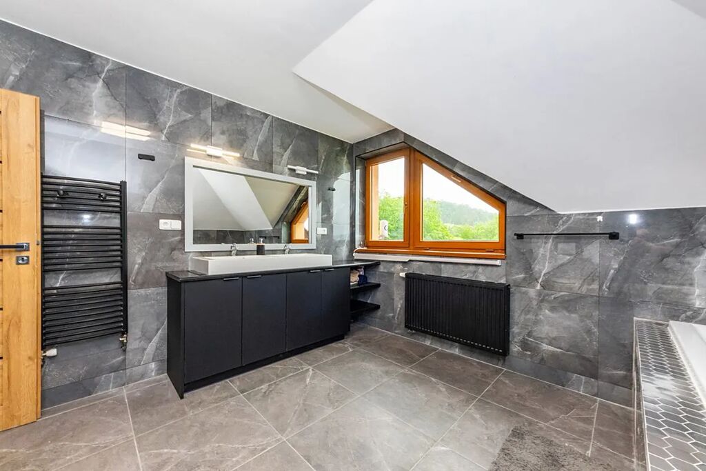 Samostatně stojící dům se dvěma nadzemními podlažími a jedním podzemním podlažím nabízí více než pět pokojů, dvě koupelny, domácí saunu a posilovnu, což zaručuje komfortní bydlení pro každou početnou rodinu.