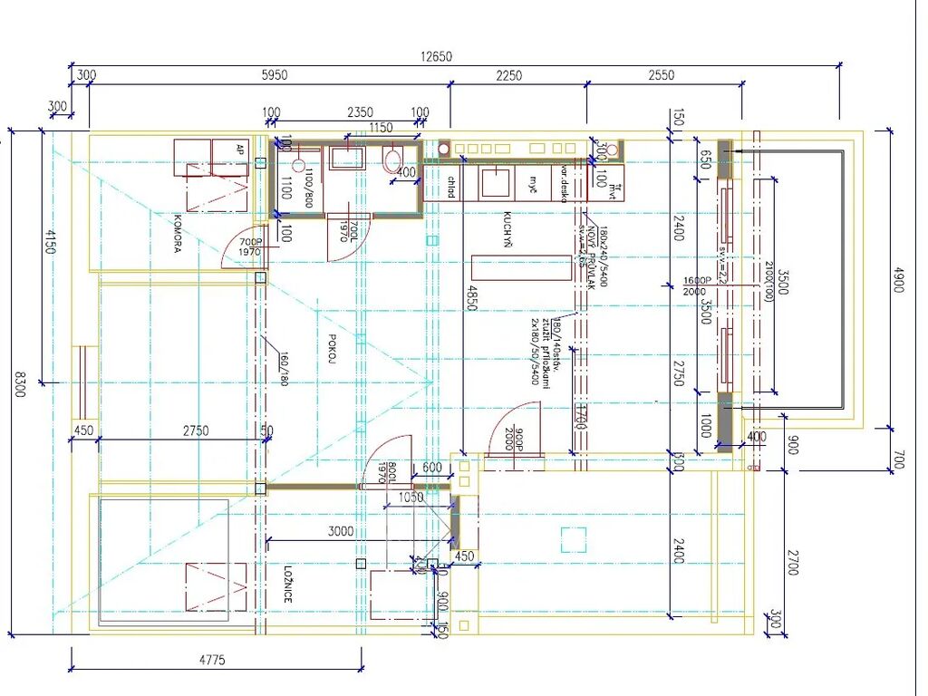 Dle dohody připravit příčku s posuvnými dveřmi a vytvořit jednu ložnici navíc pro 3kk.