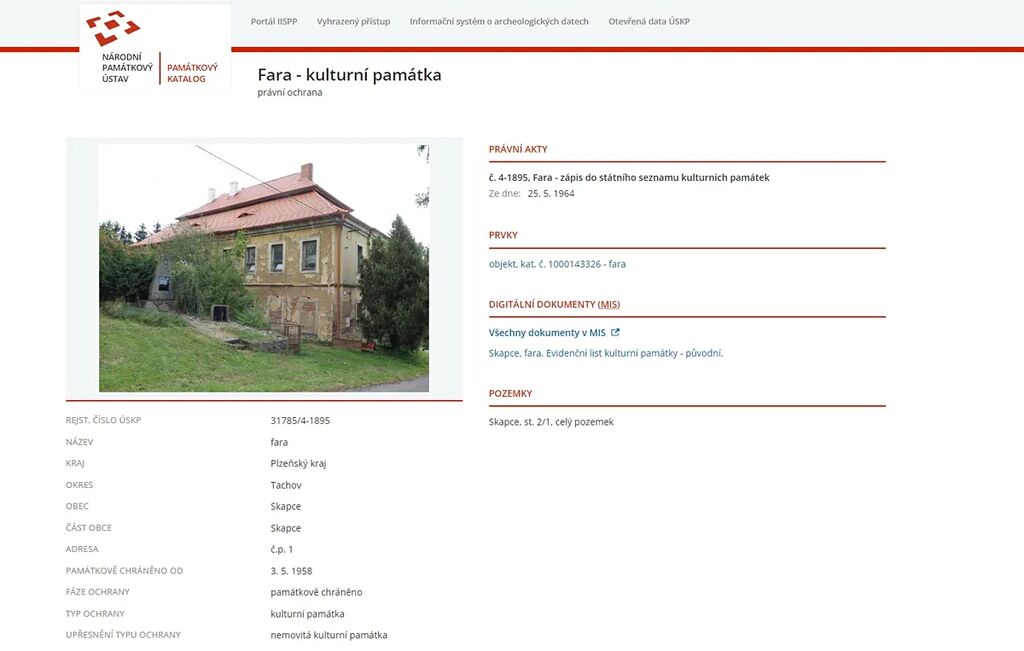 V exkluzivním zastoupení Vám nabízíme prodej historického objektu v malebné obci Skapce, nacházející se 5 km od kladrubského kláštera. K nemovitosti náleží též pozemek o velikosti 10 314 m2. Zastavěná plocha činí 465 m2. Nemovitost má působivou historii, stavbu zadal opat Kladrubského kláštera kolem roku 1720 známému architektu Janu Blažejovi Santini-Aichelovi, který zde postavil letní rezidenci mnichů z nedalekého slavného kláštera. Typická Santiniho práce – hra světla a stínů – je vidět nejvíce na stropech v interiérech. Současní majitelé využívali na opravy objektu státní dotace. Největším úspěchem je rekonstrukce střechy, kterou můžete vidět na přiložených fotografiích. Majitelé přebývali v prvním patře, kde se nachází letní byt, zahrnující několik rozlehlých částečně zařízených pokojů. Objekt je vytápěn kamny na tuhá paliva, je zde zavedena elektřina, pitná voda z řadu, bojler, septik s trativodem. Ve sklepě byla nalezena pitná voda kojenecké kvality. Za domem je opravdu rozsáhlá hektarová zahrada, která skýtá nesčetně možností využití. S historickou stavbou sousedí překrásný kostel, který je svépomocí velmi citlivě rekonstruován. Historická budova ve Skapcích č.p. 1 hledá nadšence, který se do kouzelného místa, klidu a historie zamiluje. Objekt je památkově chráněn a v územním plánu obce veden jako objekt občanského vybavení, s možností výstavby soukromého bytu o velikosti až 160 m2, zbytek objektu by byl vhodný pro ubytování, lázeňství, sociální služby, svatební resort, domov důchodců apod. Rádi Vám nemovitost ukážeme.