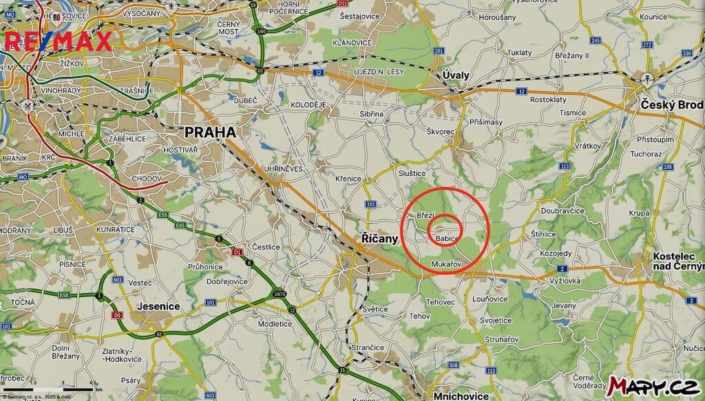 Dopravní dostupnost: Praha 21 km metro A i C, vlak Český Brod i Říčany, PID: Autobusová zastávka cca 300 m se spojem na vlakové nádraží na Prahu