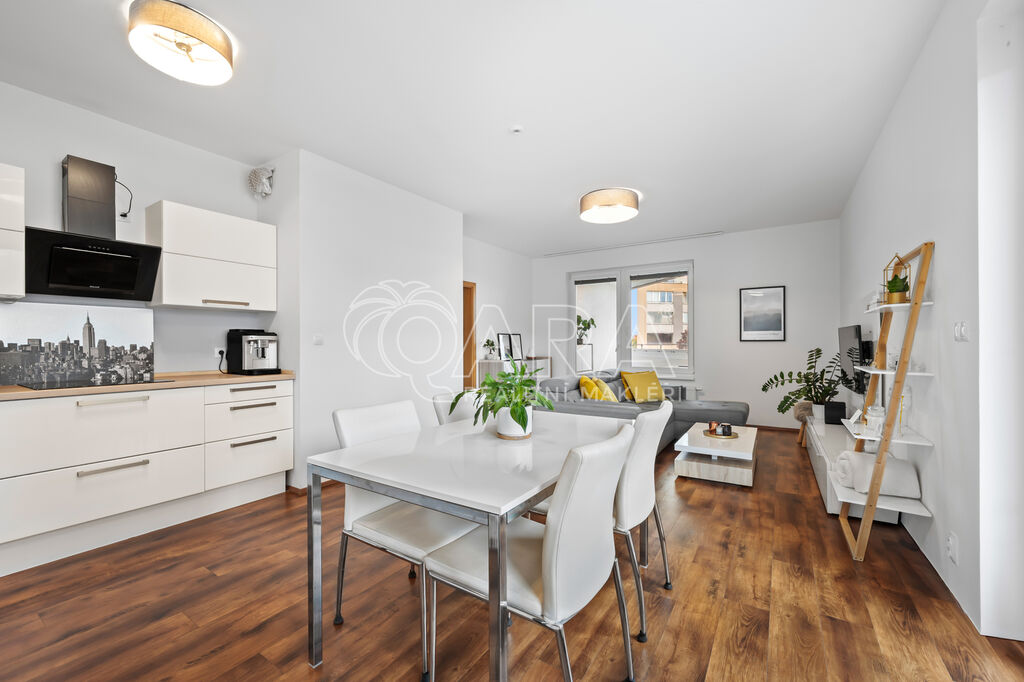 Byt se nachází ve 3. nadzemním podlaží velmi dobře udržovaného domu se dvěma výtahy. Obě lodžie jsou navíc zasklené a umožňují tak jejich celoroční využití – třeba jako domácí kancelář, relaxační zónu nebo posilovnu. Samozřejmostí je kuchyňská linka se spotřebiči, vestavěné skříně a také praktická komora.