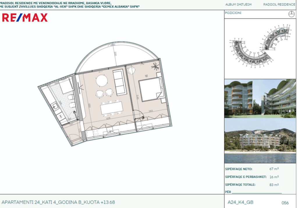 Nabízíme k prodeji moderně koncipovaný apartmán 2 + kk, který se nachází v malebné obci Radhimë, okres Vlora. Tento cihlový objekt s nízkoenergetickým standardem je umístěn ve vyhledávané lokalitě, která nabízí ideální podmínky pro investice do nemovitostí. S celkovou plochou 75 m² a užitnou plochou 67 m², plus přístupnou terasou o ploše 16 m², se jedná o atraktivní příležitost, která slibuje potenciální výnosy.