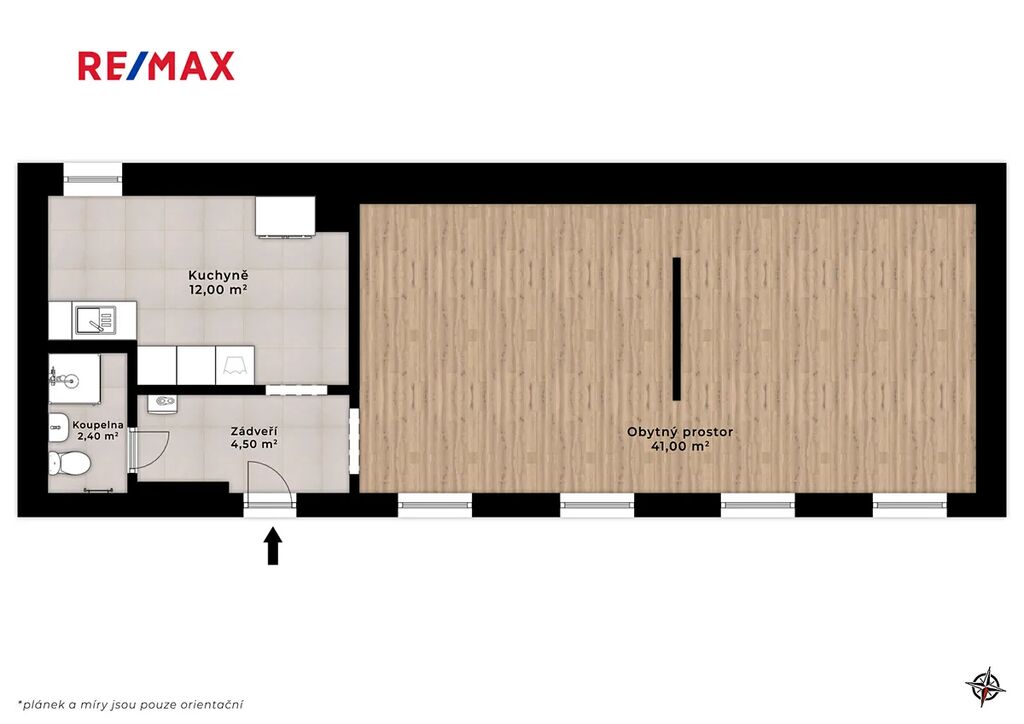 Současná dispozice zahrnuje předsíň, hlavní otevřený prostor, kuchyňku a koupelnu se sprchou a WC.