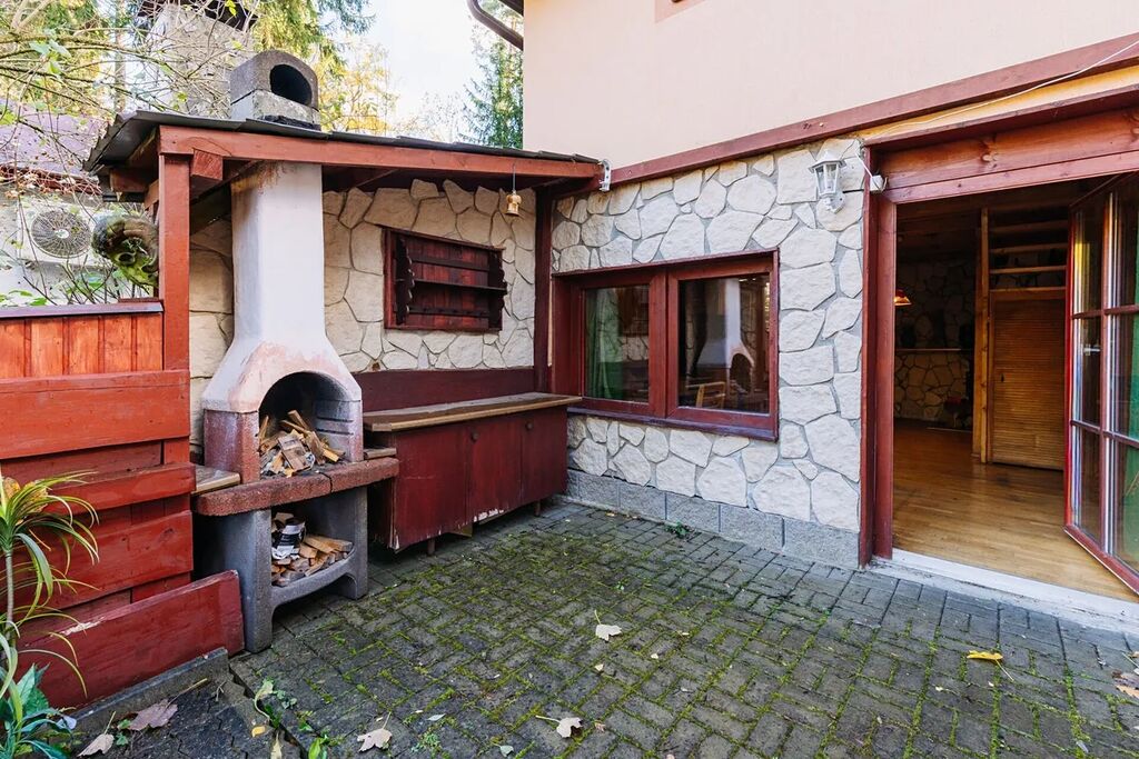 Z obývacího pokoje je přímý vstup na spodní terasu s venkovní kuchyní a krbem, ideální pro letní posezení a grilování.