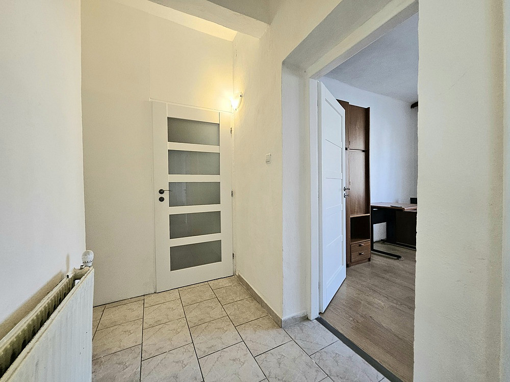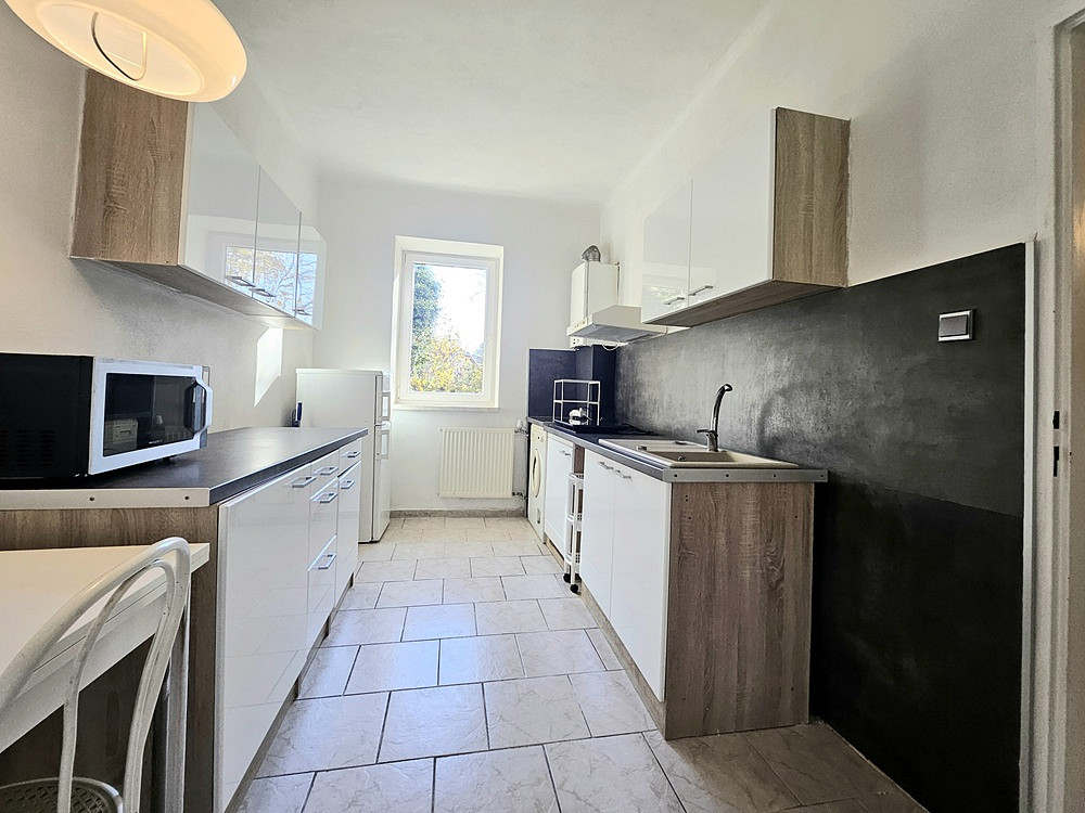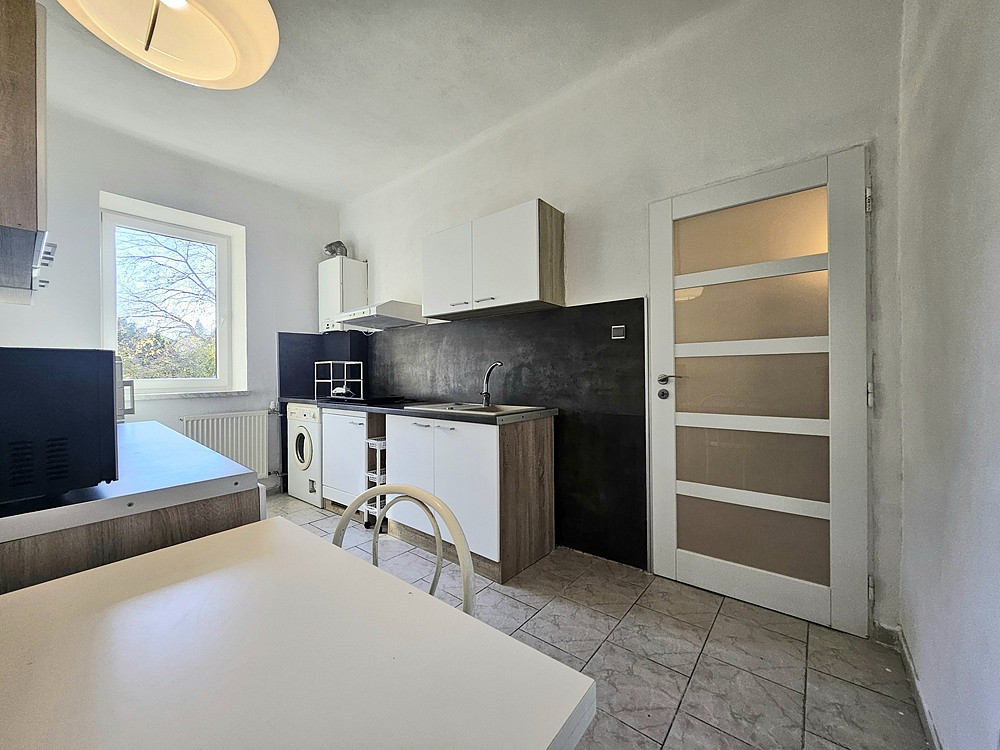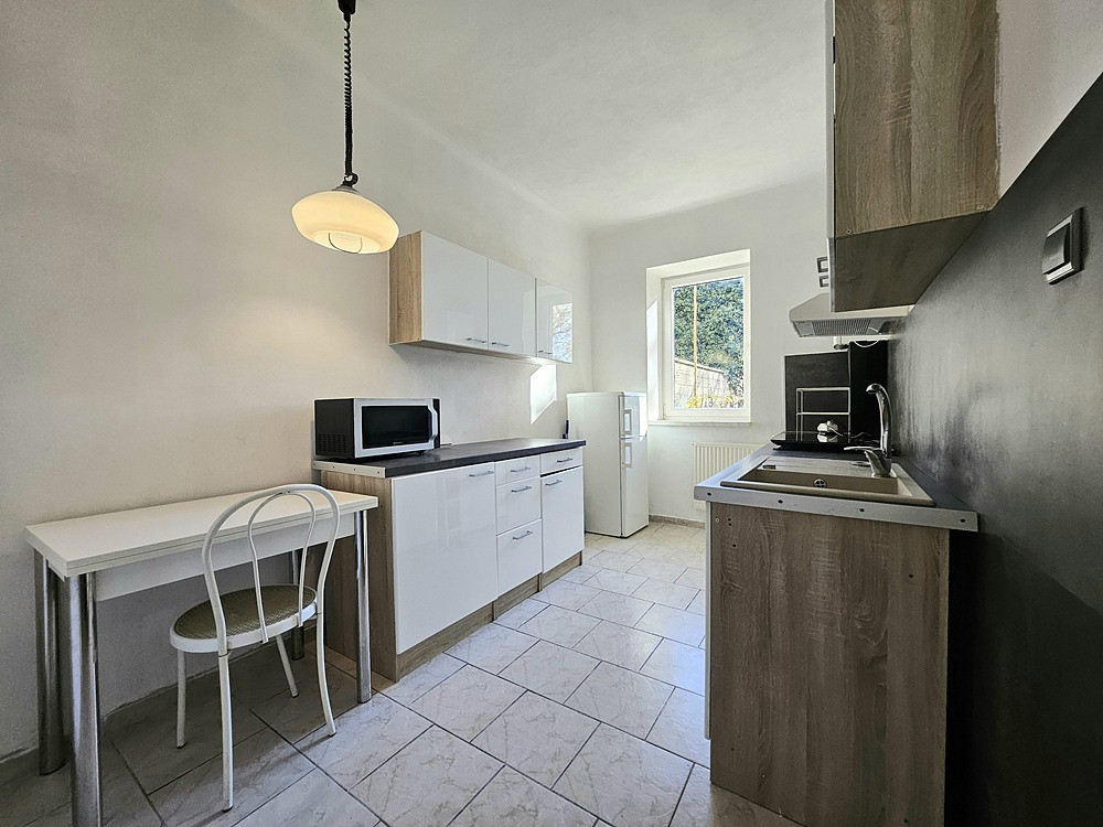 Byt o celkové ploše 33 m² se nachází v přízemí rodinného domu. Nabízí se zařízený, je zde zánovní kuchyňská linka se spotřebiči (indukční varná deska, digestoř, lednice, mikrovlnná trouba, pračka), jídelní stůl a 2 židle, v pokoji jednolůžko s úložným prostorem, konferenční stůl, psací stůl, obývací stěna, kusový nábytek (po dohodě lze pronajmout bez vybavení, které je na fotografiích).