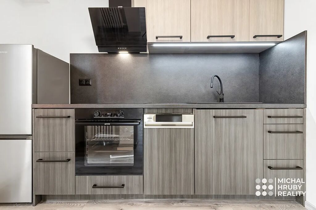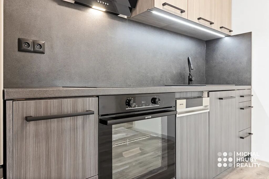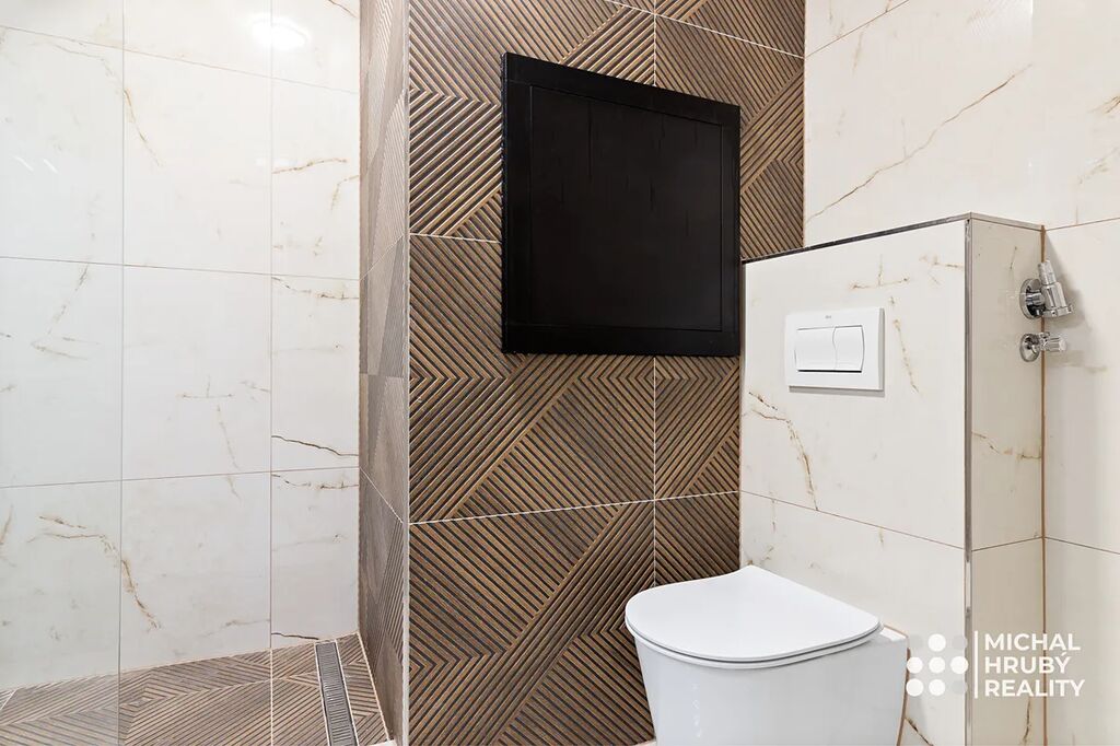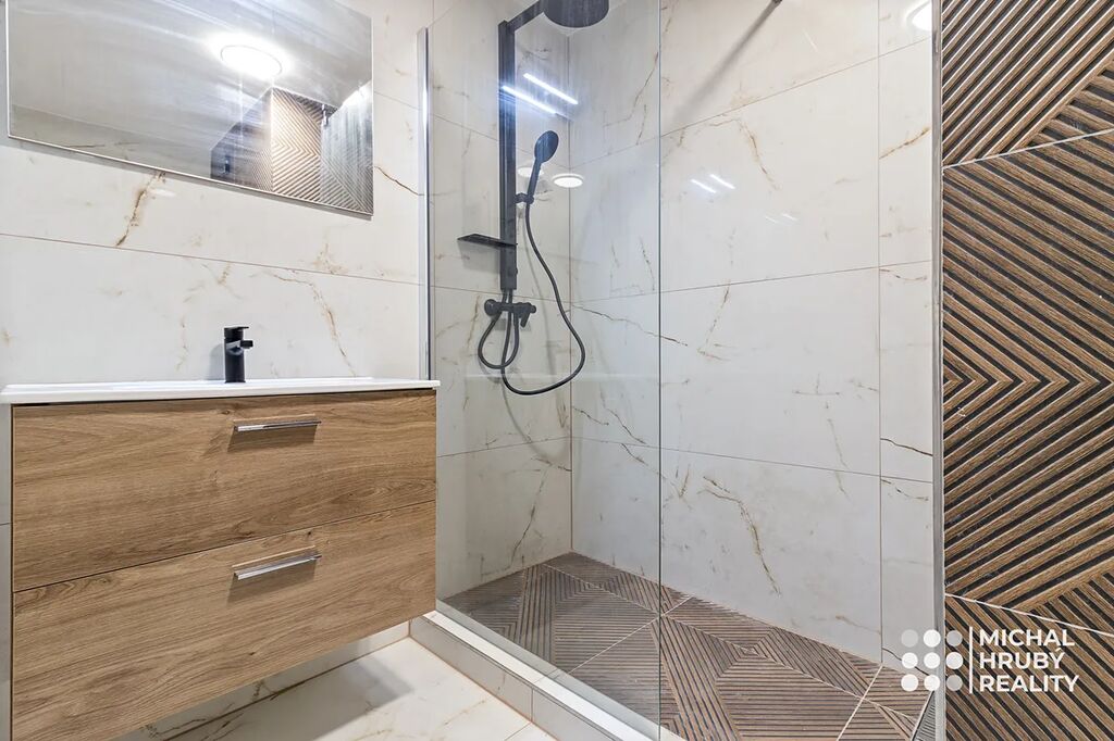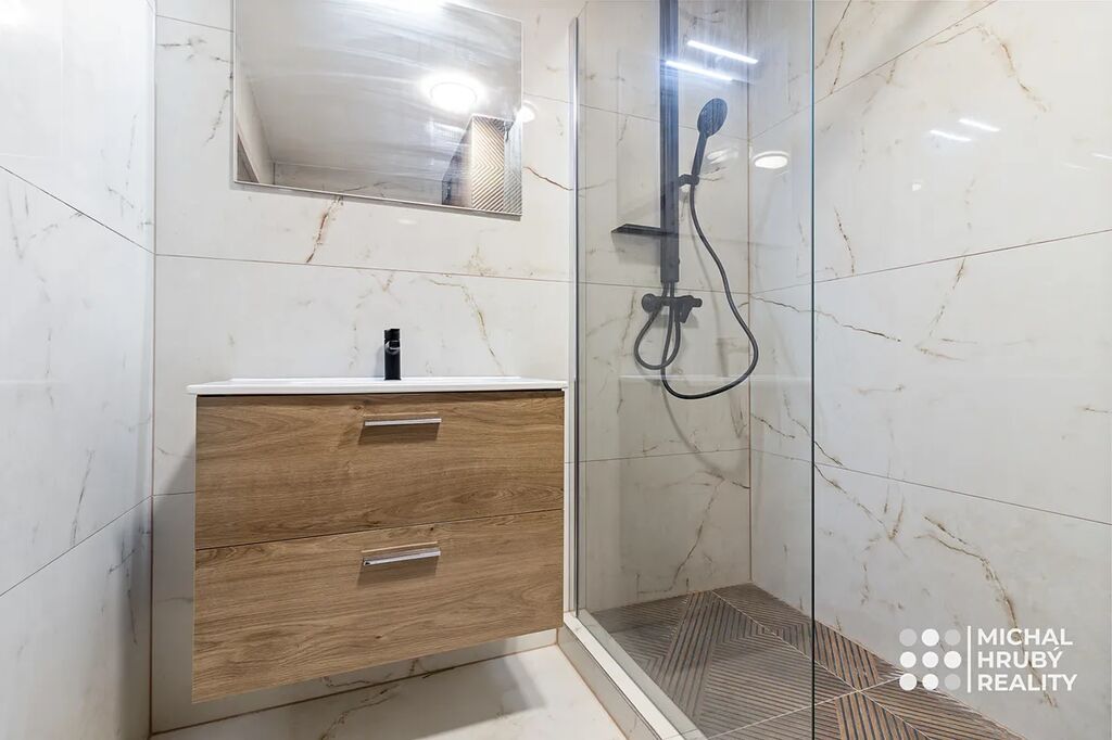 Nejvíce to jde vidět na moderně pojaté koupelně, kromě nadčasového designu, moderního sprchového koutu tady budete mít i vyhřívanou podlahu. Kuchyně je dělaná bytu na míru vč. značkových spotřebičů a trochu se hýbalo s příčkami, aby tady vznikl dobře využitelný prostor. Oba pokoje jsou neprůchozí s výhledem do zeleně.