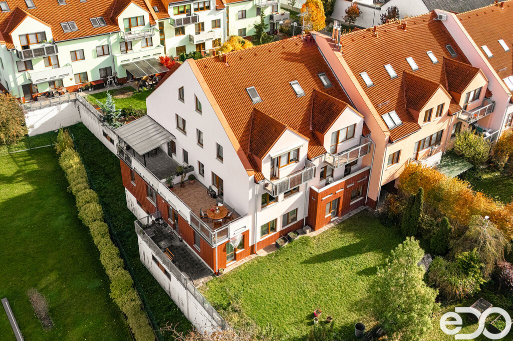 Dispozice bytu nabízí prostorný obývací pokoj s kuchyňským koutem a přímým vstupem na velkou terasu o ploše 23,7 m², dále dva samostatné pokoje, koupelnu s vanou, samostatné WC a předsíň s úložnými prostory.