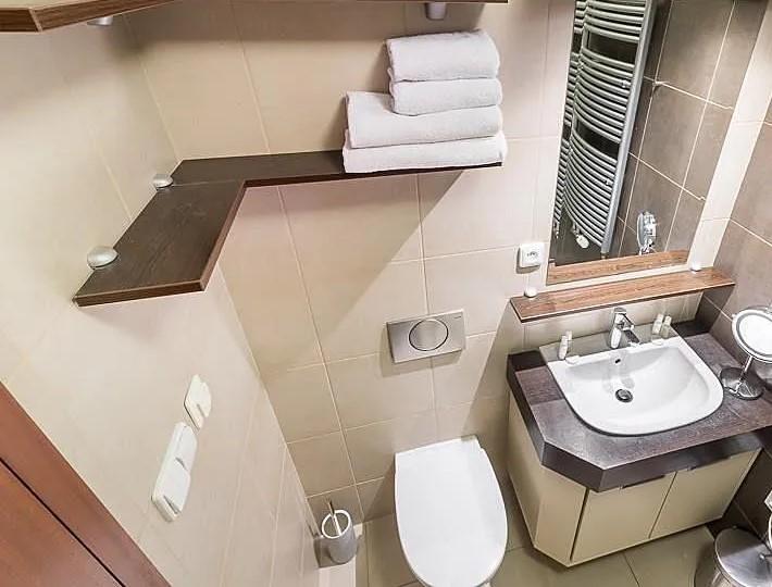 Součástí bytu je prostorná koupelna se sprchovým koutem, pračkou, sušičkou a podlahovým topením. Obývací část je oddělena barovým pultem, dřevěná podlaha s podlahovým topením dodává interiéru příjemnou atmosféru a komfort.