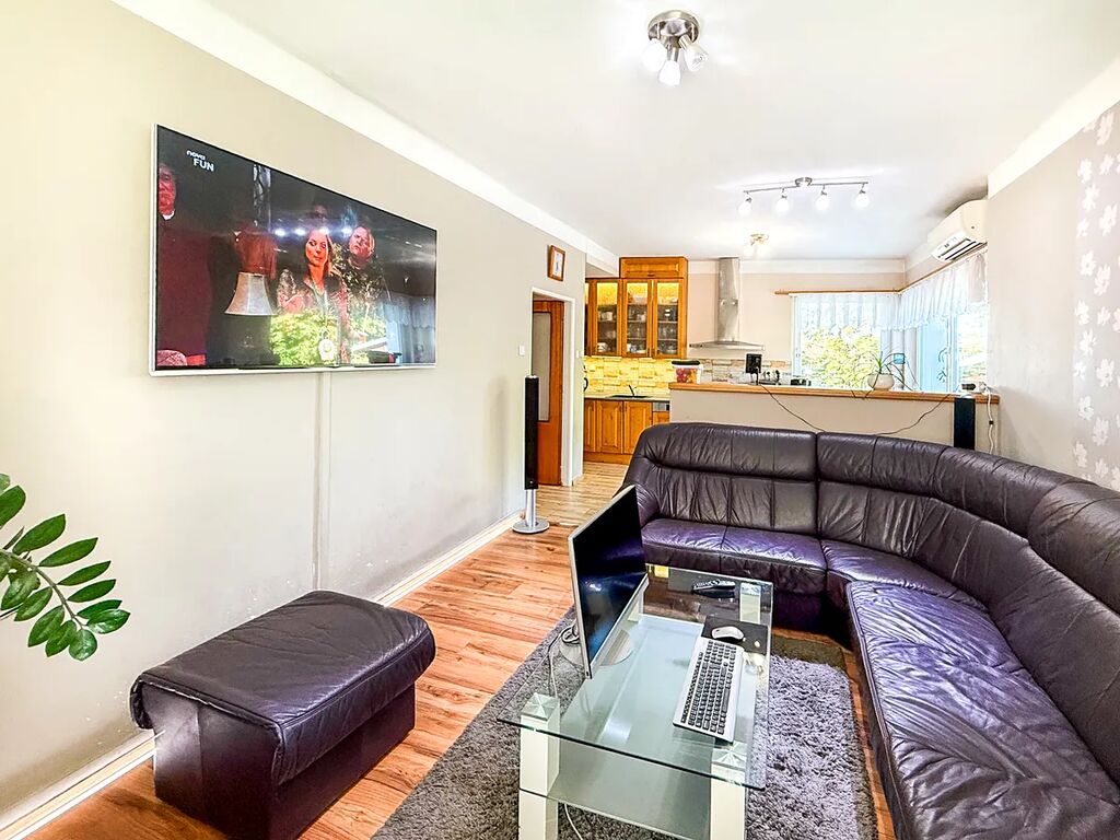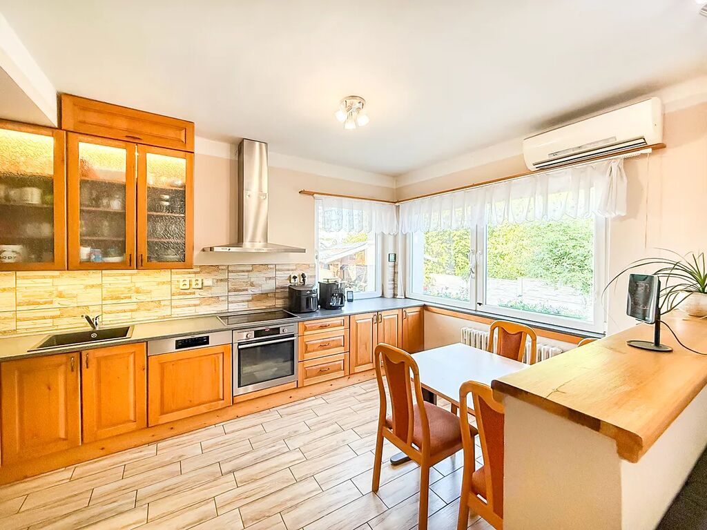 Dům o užitné ploše 104 m2 sestává ze vstupní kryté verandy (možno i jako kancelář), vstupní chodby, obývacího pokoje propojeného pouze vzdušnou variantou dělícího pultu do kuchyňské části s jídelním koutem, ložnice, dalšího pokoje, koupelny s vanou i sprchových koutem a samostatné toalety. V suterénu domu je další obytná místnost (18 m2) se saunou s možností využití např. jako domácího fitness nebo kancelář. V horní části domu je půdní prostor (55 m2), kde jednu z místností lze okamžitě využít a další část zrekonstruovat pro další využití.