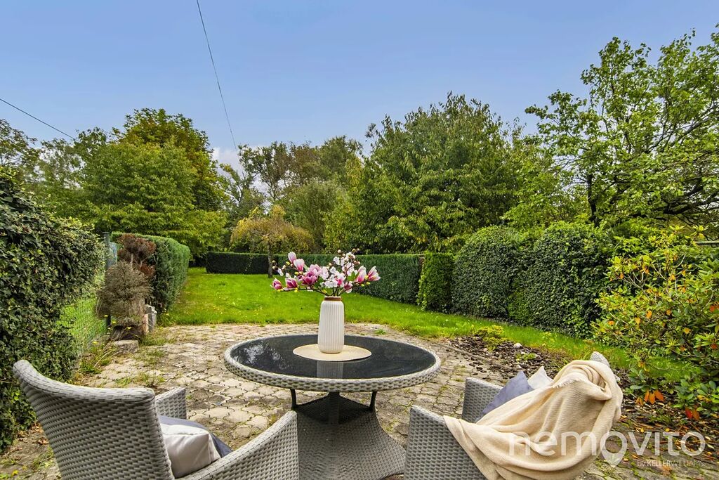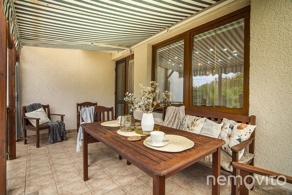 Zahrada o rozloze 527 m² nabízí díky živým plotům a okrasným dřevinám příjemné posezení u zahradního krbu i prostor pro vlastní pěstování. O trávník se stará automatický zavlažovací systém Hunter. Nechybí ani vyvýšená zastřešená terasa (12 m²) s mobilním zavětrováním, kterou využijete i za nepříznivého počasí.