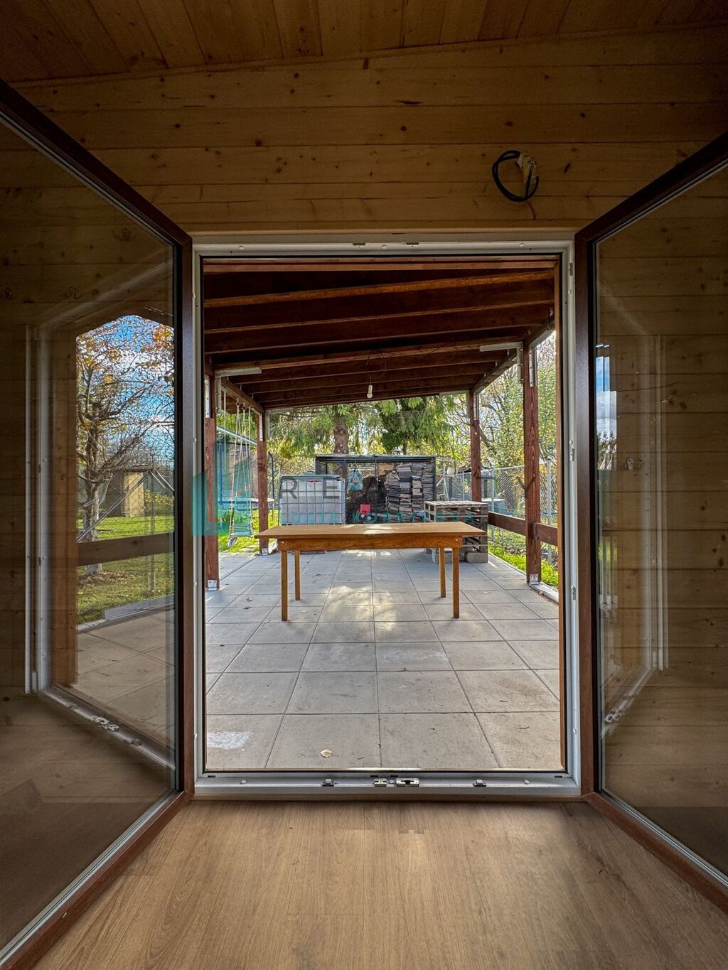 * Zpevněná a vydlážděná terasa s plochou okolo 24m2, přístupná jak z pozemku, tak i z domku francouzskými dveřmi. Je zastřešená dřevěnou pergolou